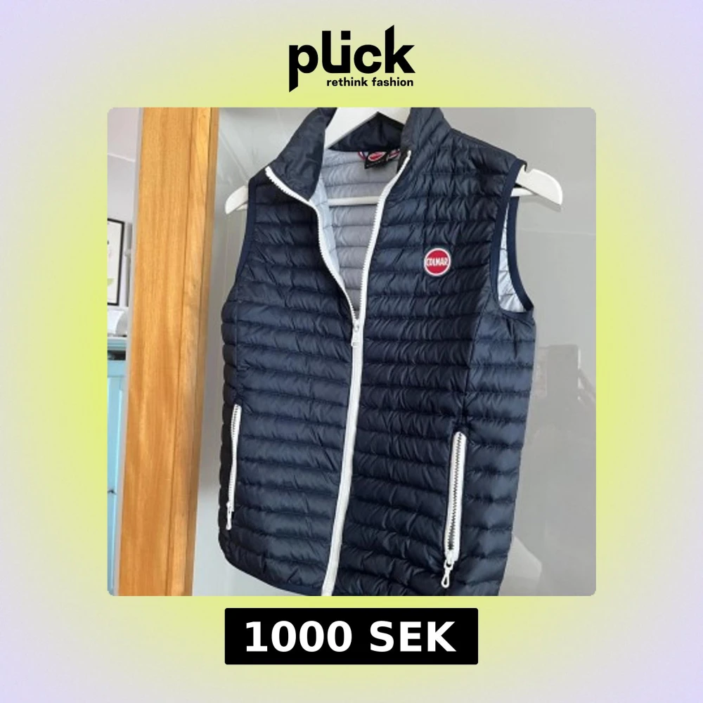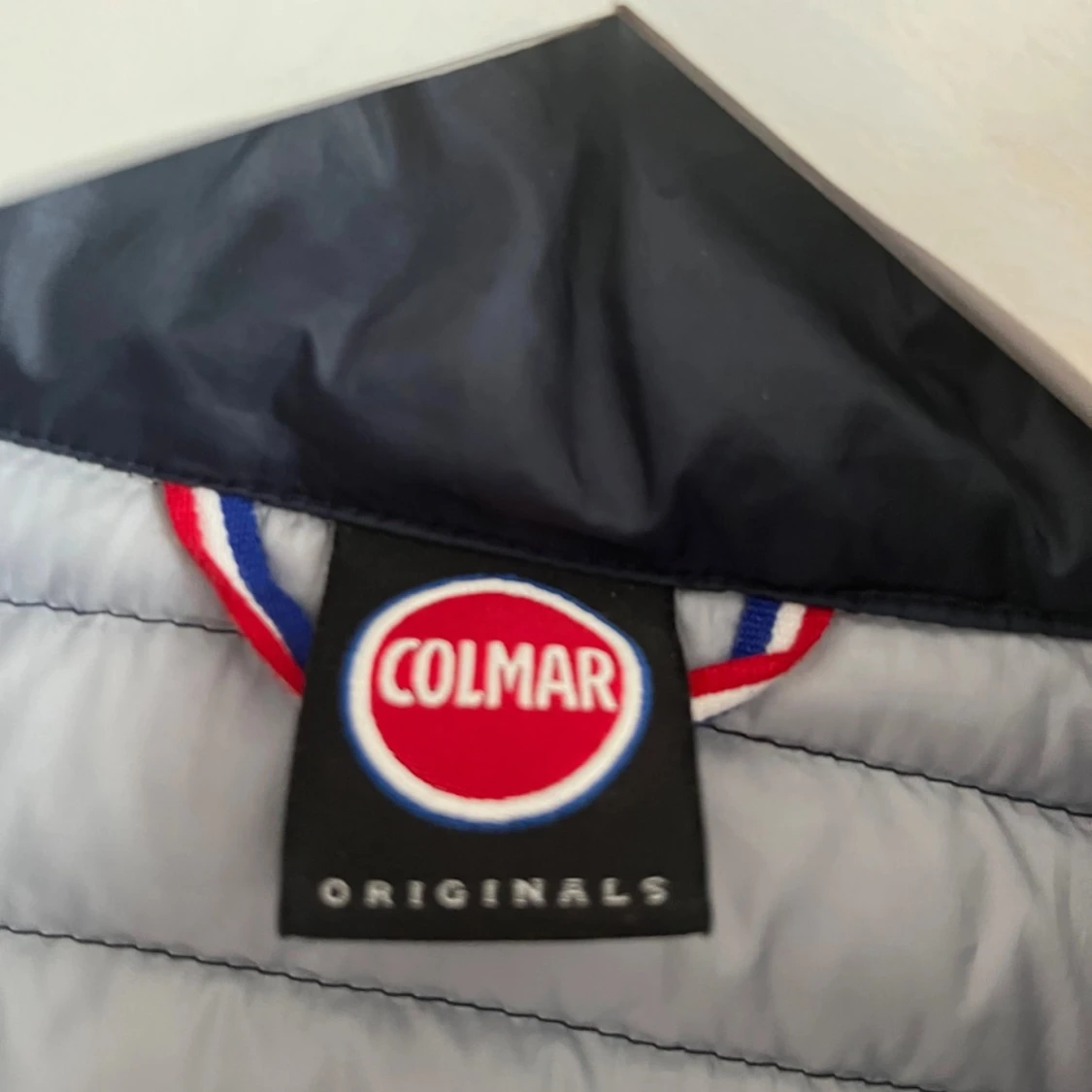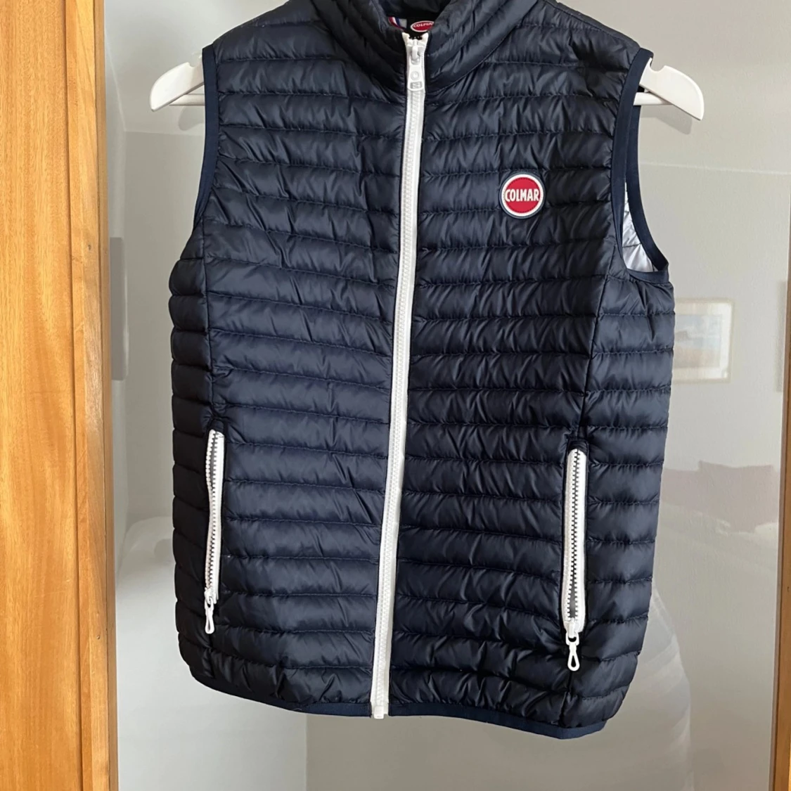 Snygg mörkblå dunväst från Colmar med vit dragkedja och logga på bröstet. Perfekt för kyligare dagar. Västen har en quiltad design och två praktiska fickor med dragkedja.