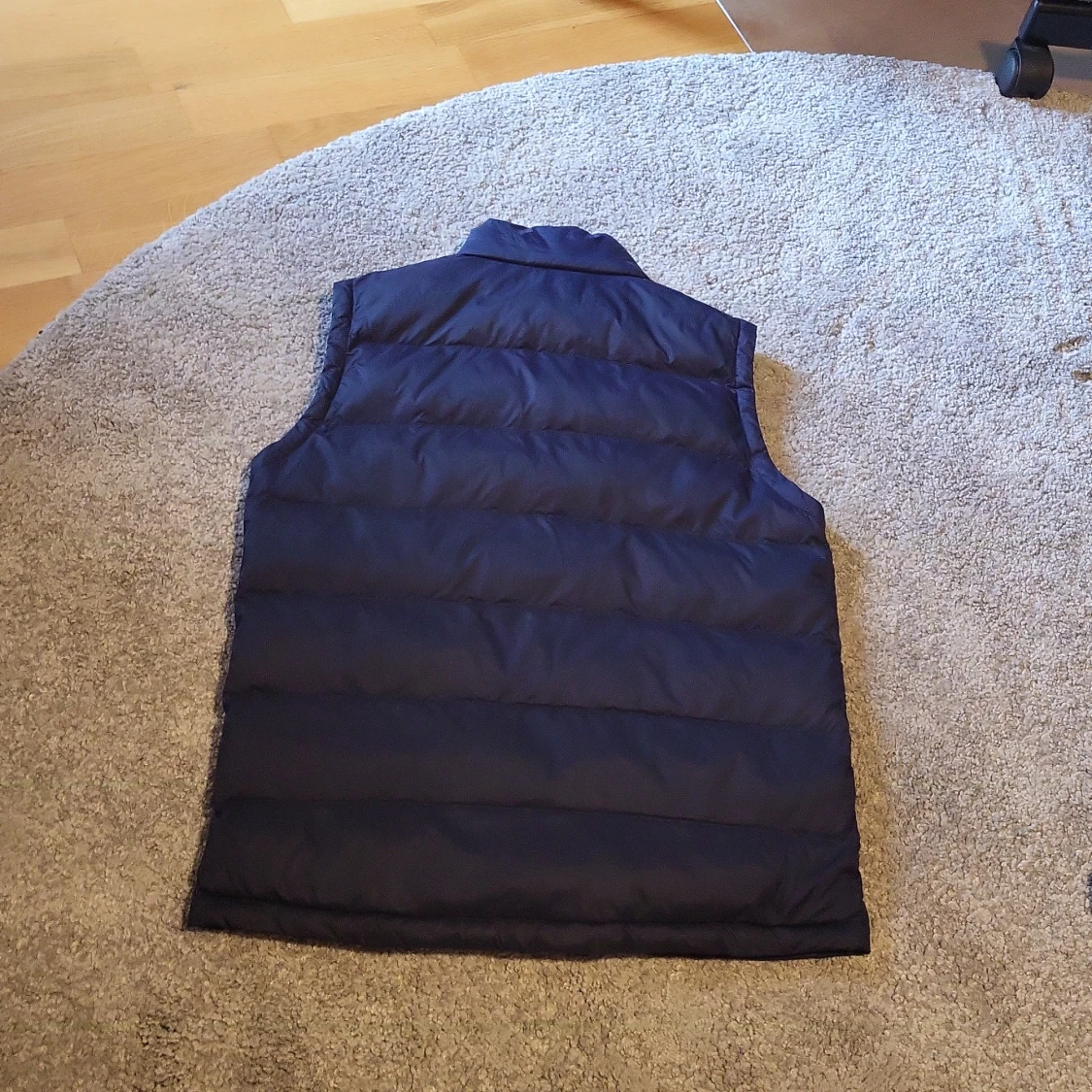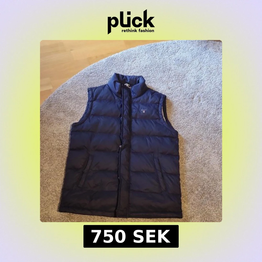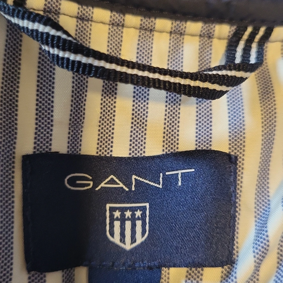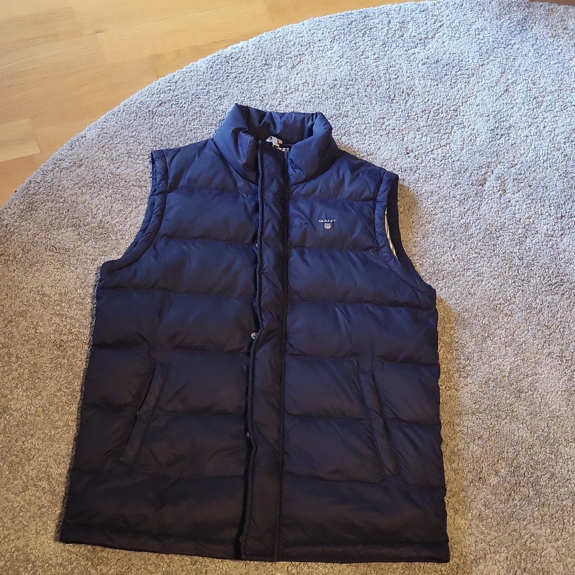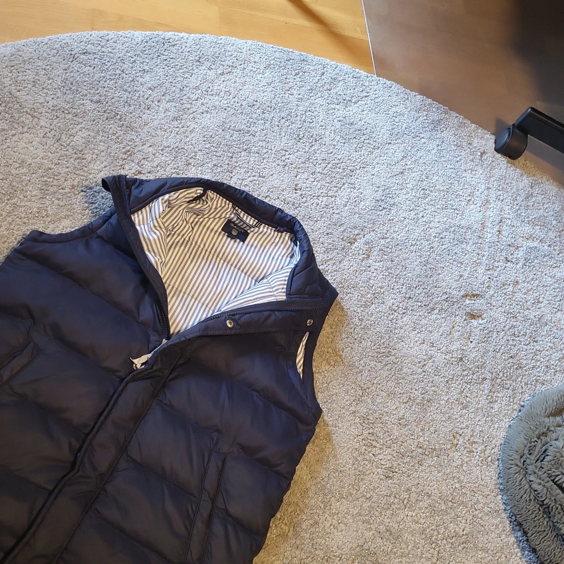 Snygg mörkblå dunväst från Gant med quiltad design och ståkrage. Västen har dragkedja framtill och två fickor. Insidan är fodrad med blåvitrandigt tyg som ger en fräsch kontrast. Perfekt för lager-på-lager under kyliga dagar.