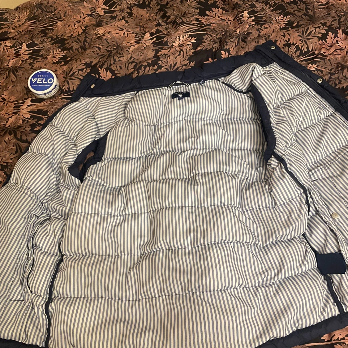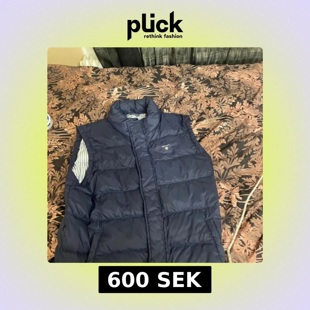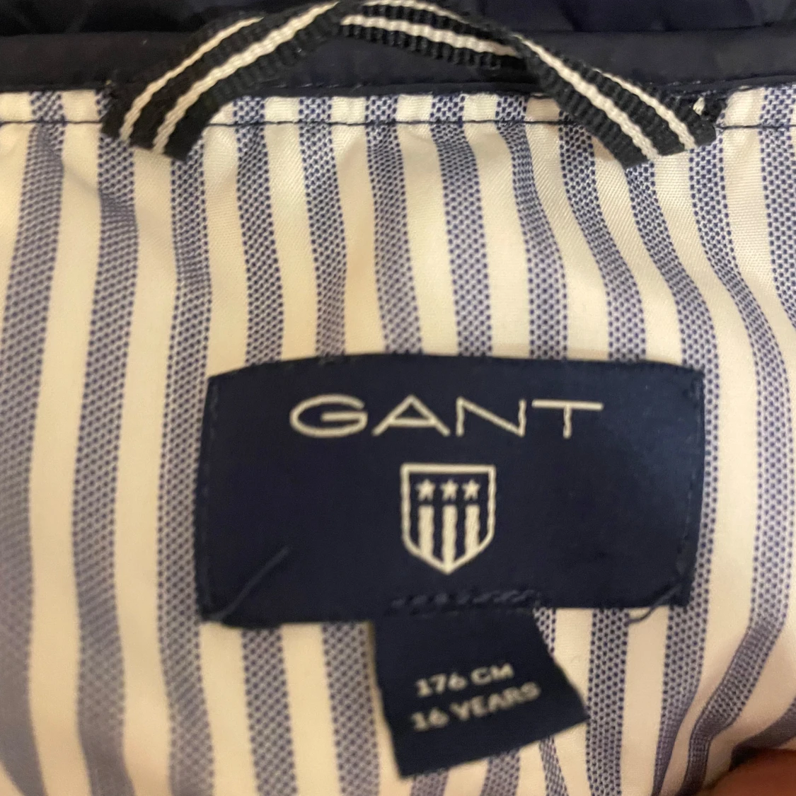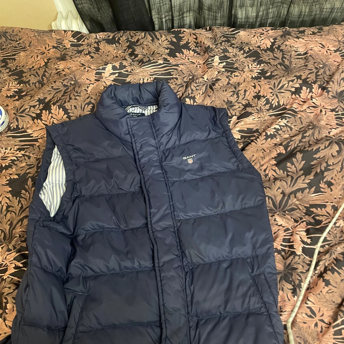 Säljer en mörkblå dunväst från GANT med quiltad design och hög krage. Västen har dragkedja framtill och insidan är fodrad med vitt och blått randigt tyg. Perfekt för lager-på-lager och snygg till både hoodie och skjorta.