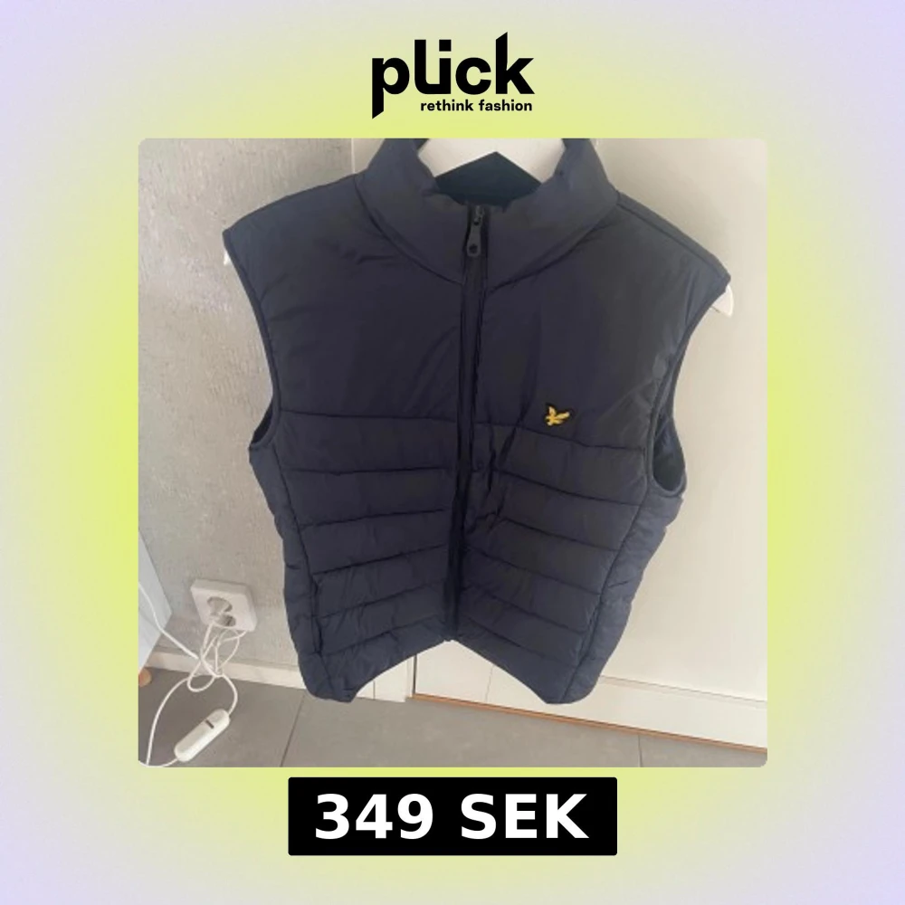 Snygg mörkblå dunväst från Lyle & Scott med klassisk gul logga på bröstet. Västen har hög krage, quiltad design och dragkedja framtill. Perfekt att slänga över en hoodie eller tröja för extra värme.