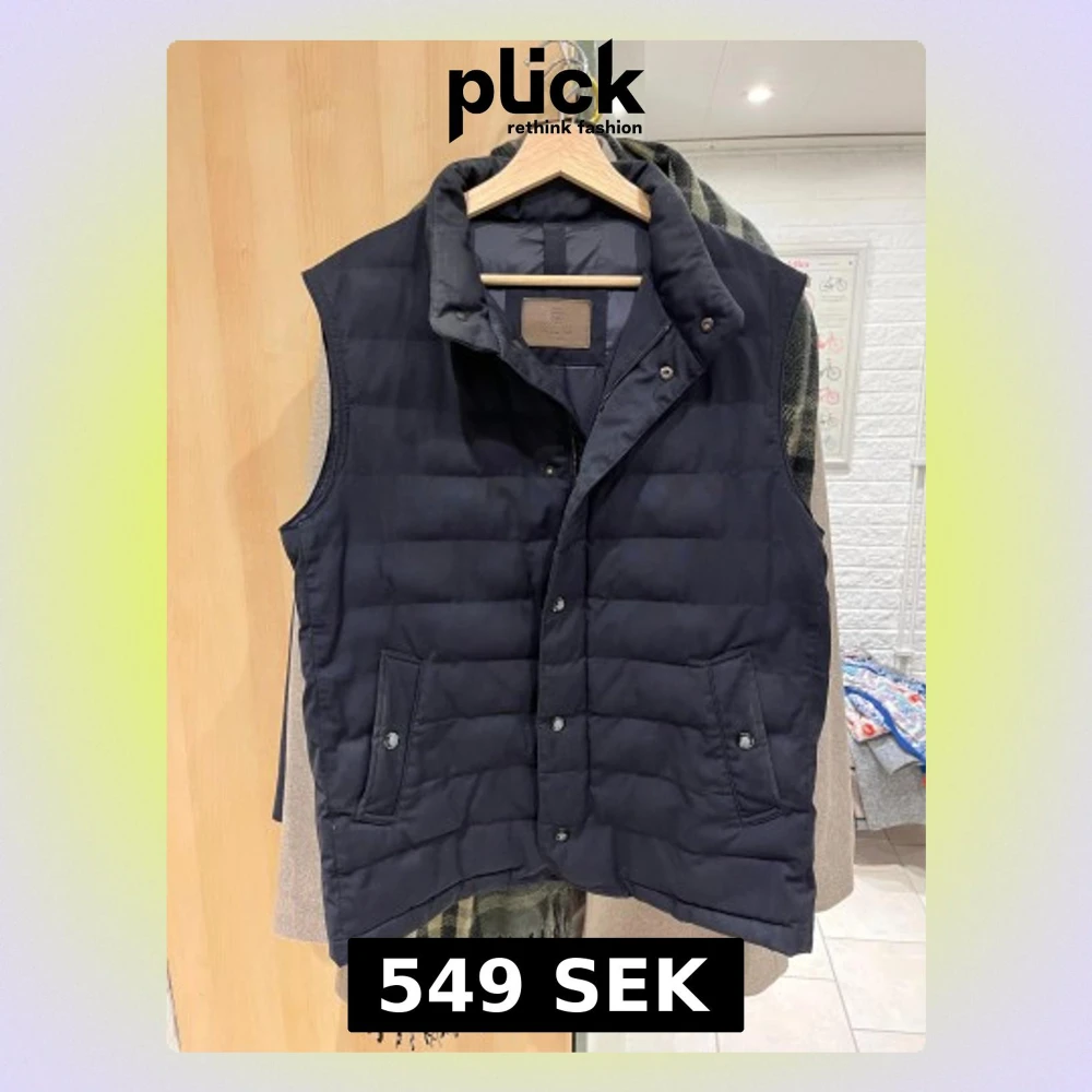 Stilren svart dunväst från Massimo Dutti med hög krage, två snedställda fickor med knappar och dragkedja framtill. Västen har quiltad design och diskreta logodetaljer på knapparna. Perfekt för lager-på-lager under kyliga dagar.