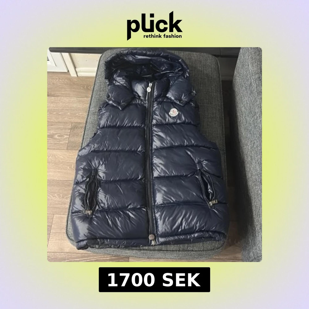 Snygg mörkblå dunväst från Moncler med glansig finish, huva och två fickor med dragkedja. Västen har ett broderat Moncler-märke på bröstet och quiltad design. Perfekt för lager-på-lager under kyliga dagar.