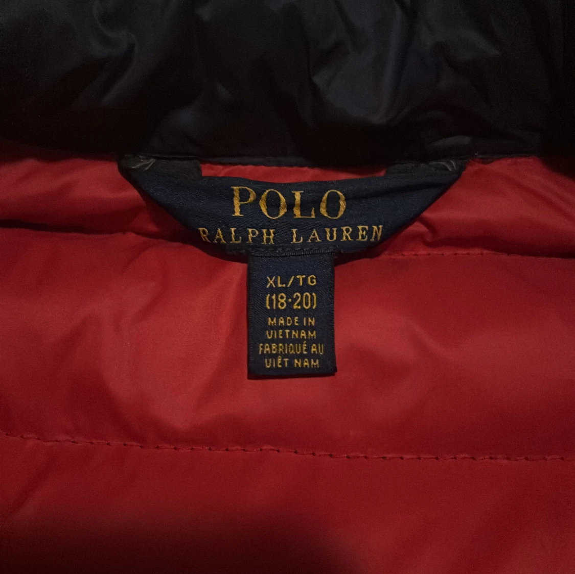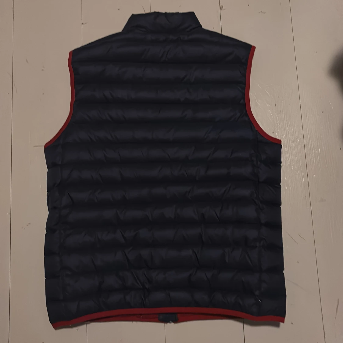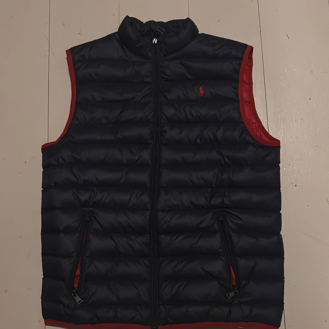 Säljer en snygg mörkblå dunväst från Ralph Lauren med röda detaljer. Västen har dragkedja framtill och två praktiska fickor med dragkedjor. Perfekt för kyligare dagar när du vill hålla stilen. 🔥