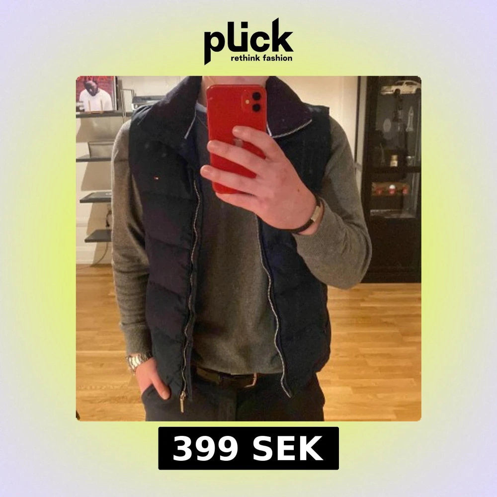 Trendig mörkblå väst från Tommy Hilfiger med dragkedja. Storlek M. Unisex. Killen på bilden är 180 cm lång