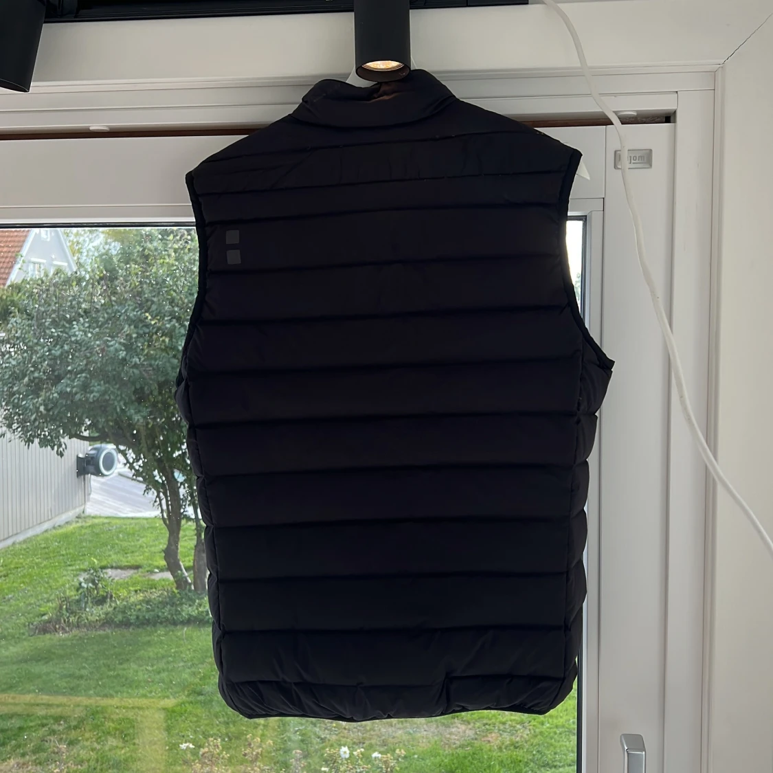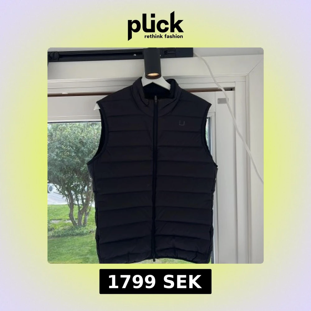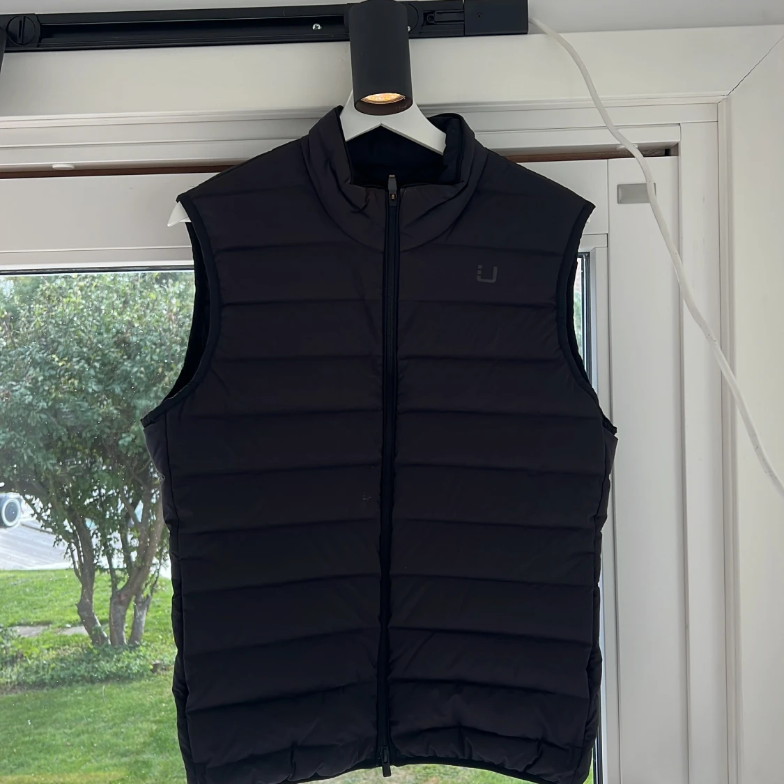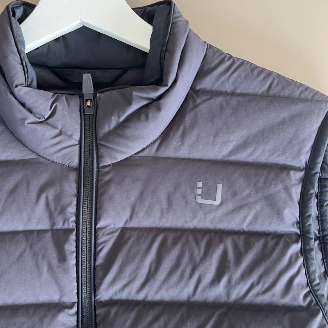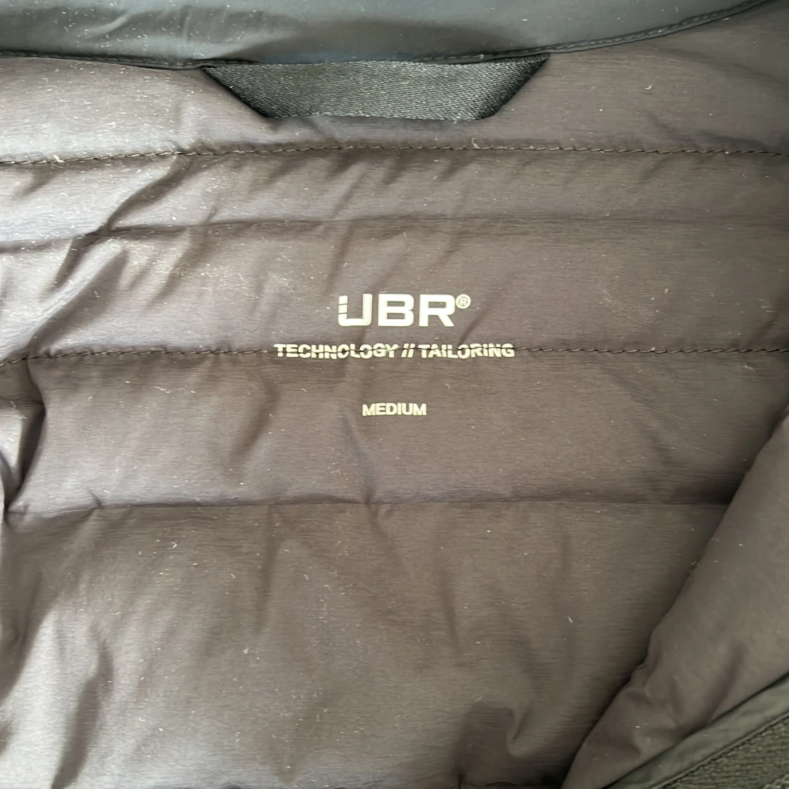 Mörkblå dunväst från UBR i storlek medium. Västen har quiltad design med horisontella sömmar, hög krage och dragkedja framtill. Materialet är polyester och dun, perfekt för kyliga dagar. Diskret UBR-logga på bröstet ger en clean look.