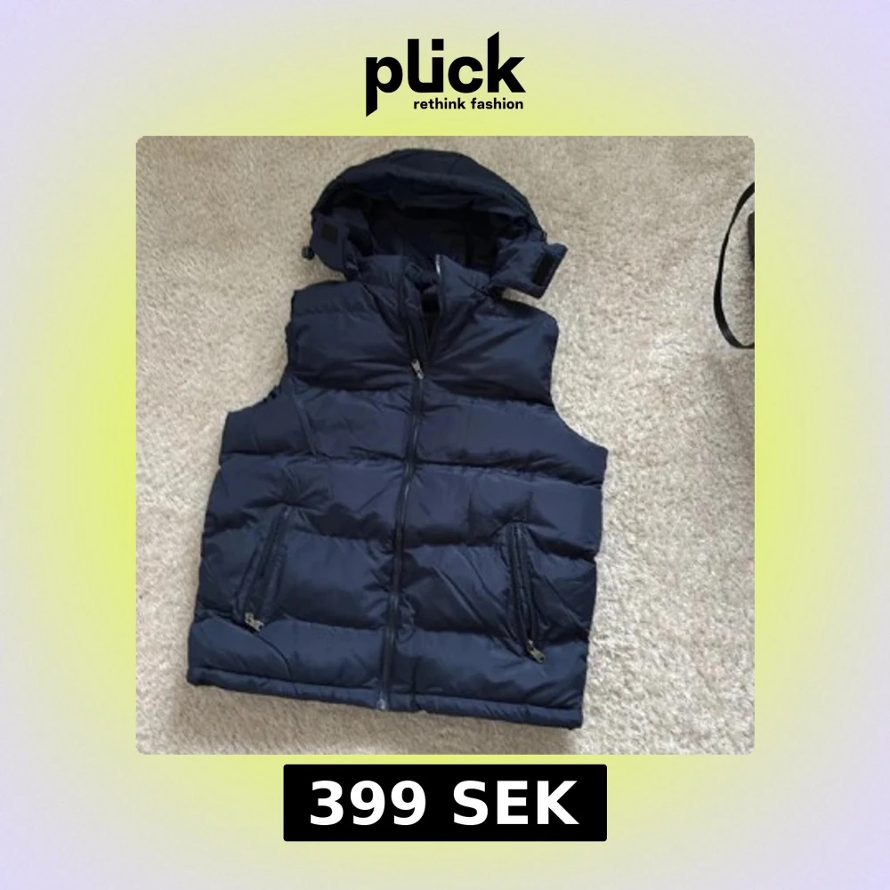 Snygg mörkblå dunväst med avtagbar huva och två praktiska fickor med dragkedja. Västen har quiltad design och hel dragkedja framtill. Perfekt för lager-på-lager och chill dagar utomhus. Har samma väst i storlek xs, s och m alla helt nya