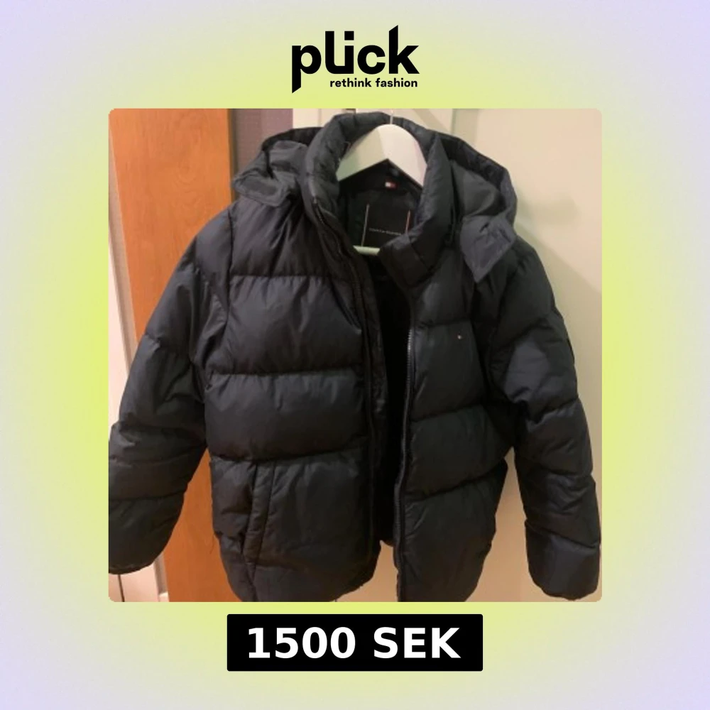 Mörkblå Essential down jacka från Tommy Hilfiger med huva och dragkedja. Jackan har en klassisk look och är vadderad för extra värme. Insidan har logotypen broderad i nacken och diskreta röda och vita detaljer längs fodret. Perfekt för kalla dagar. Jackan har en liten reva i ryggen.