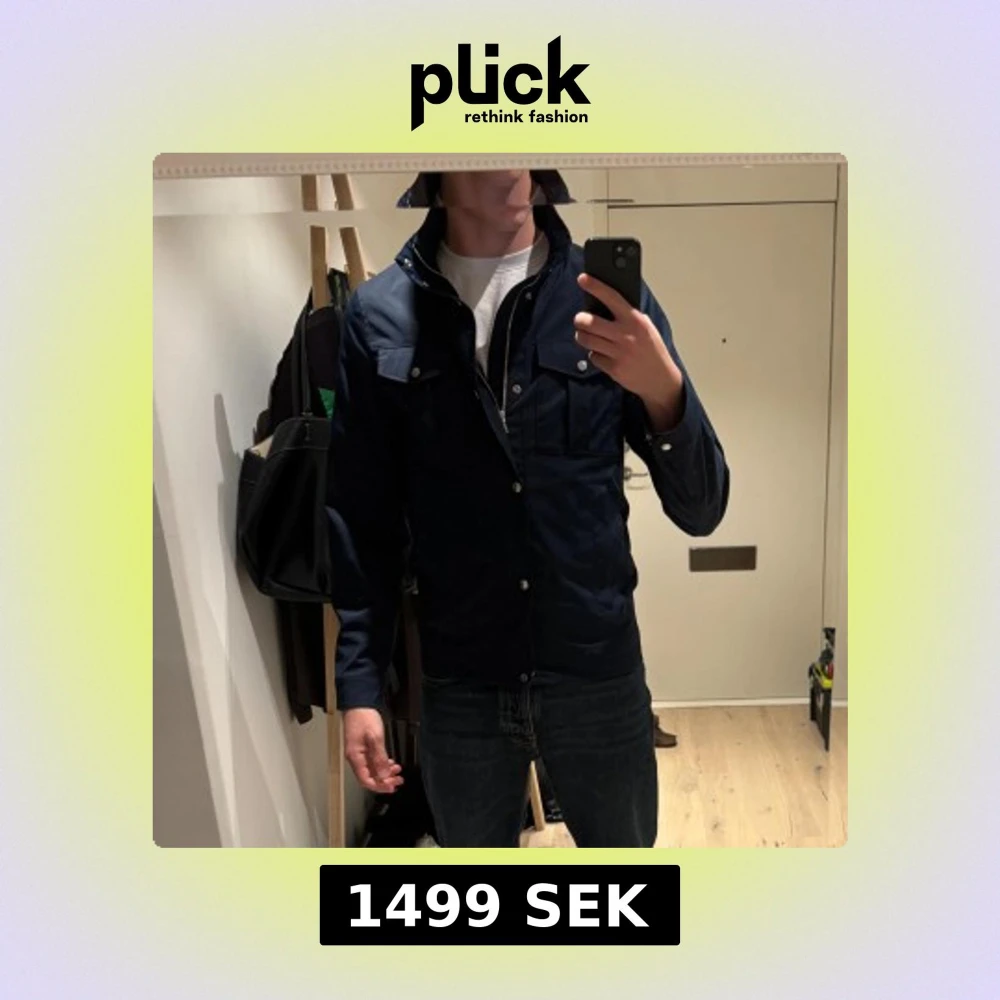 Snygg mörkblå field jacket med silverfärgade knappar och dragkedja framtill. Storlek S