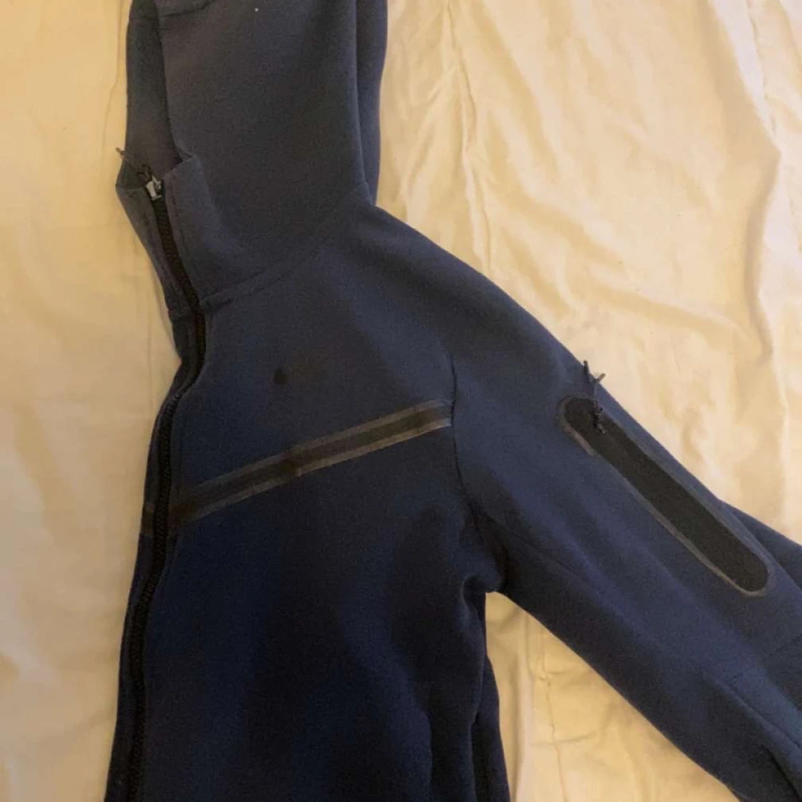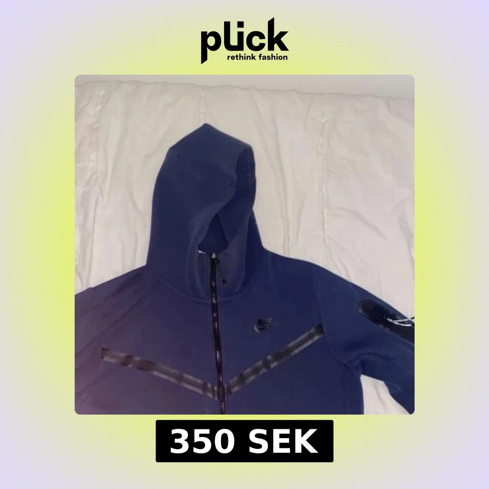 Säljer en mörkblå hoodie från Nike med dragkedja och huva. Jackan har en stilren design med diskreta detaljer och en ficka på ärmen. Perfekt för en sportig look.