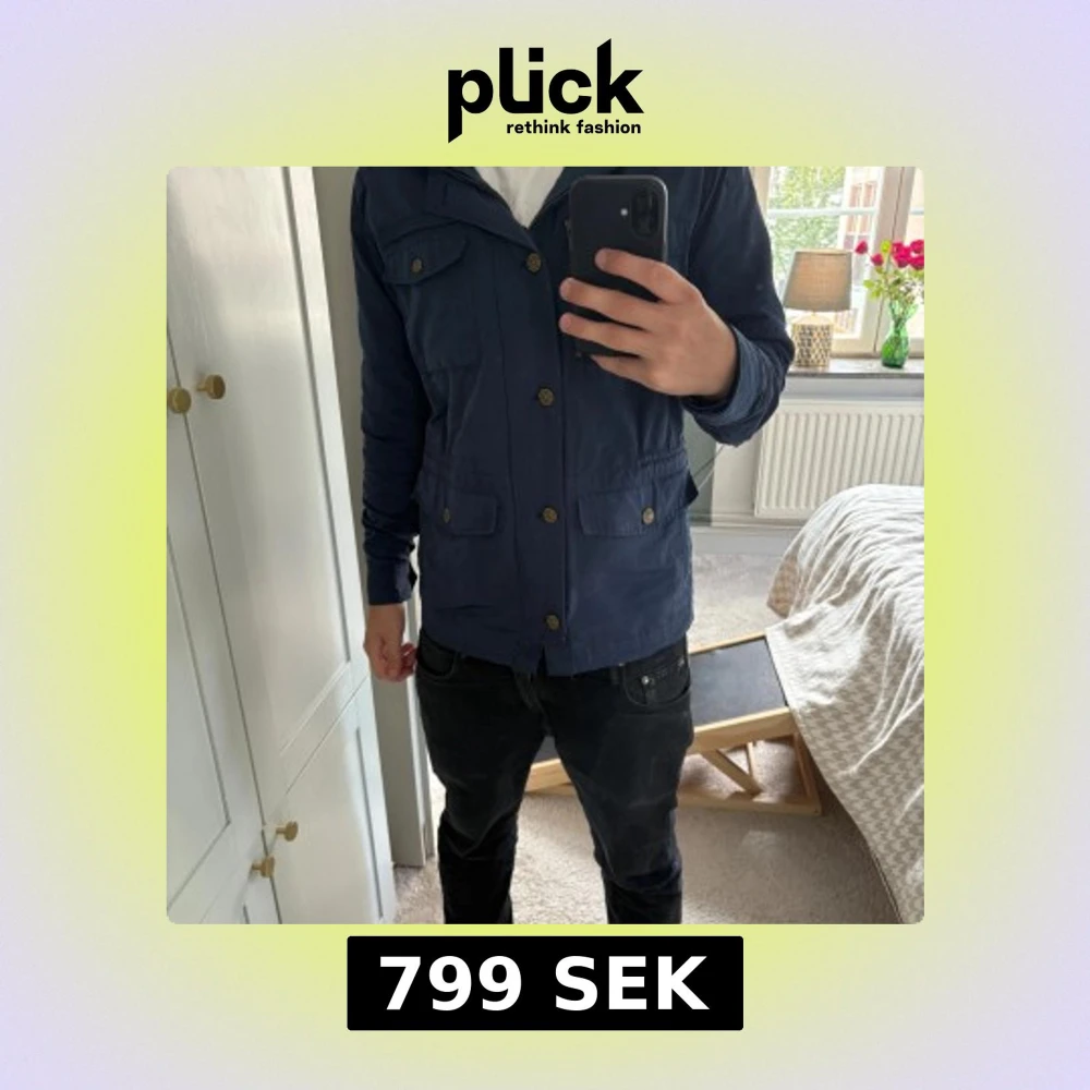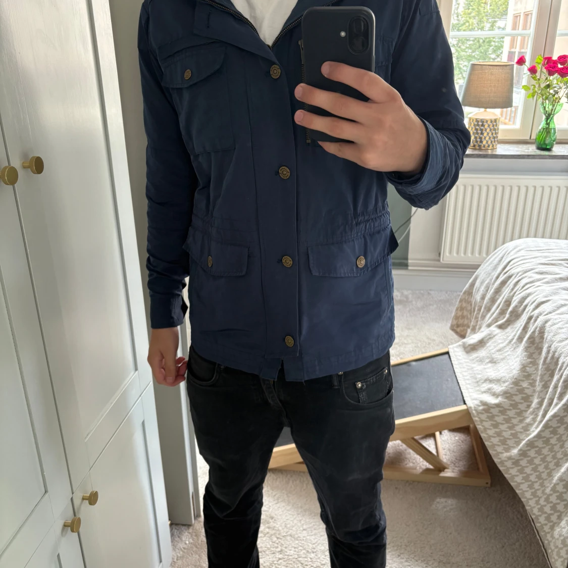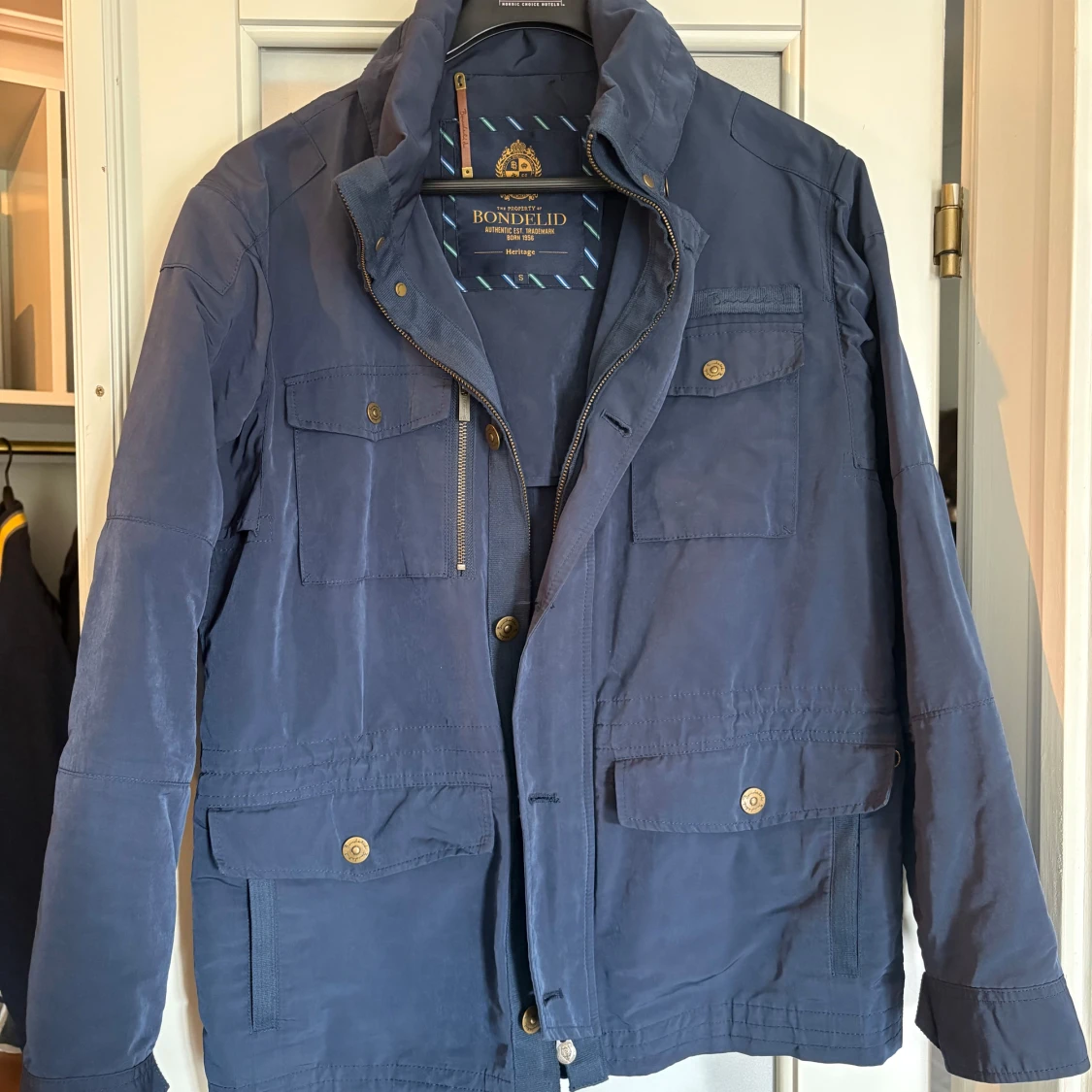 Snygg mörkblå jacka från Bondelid med flera fickor framtill, knappar och dragkedja. Klassisk design med hög krage och detaljer i guld. Perfekt för dig som gillar stilren och funktionell look. Materialet känns slitstarkt och passar bra till höst och vår.