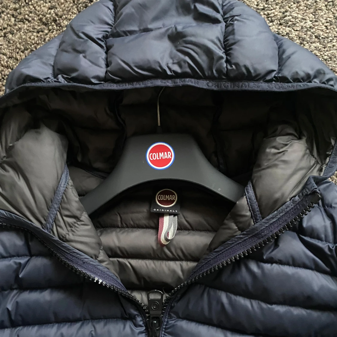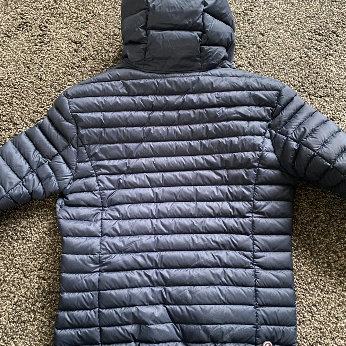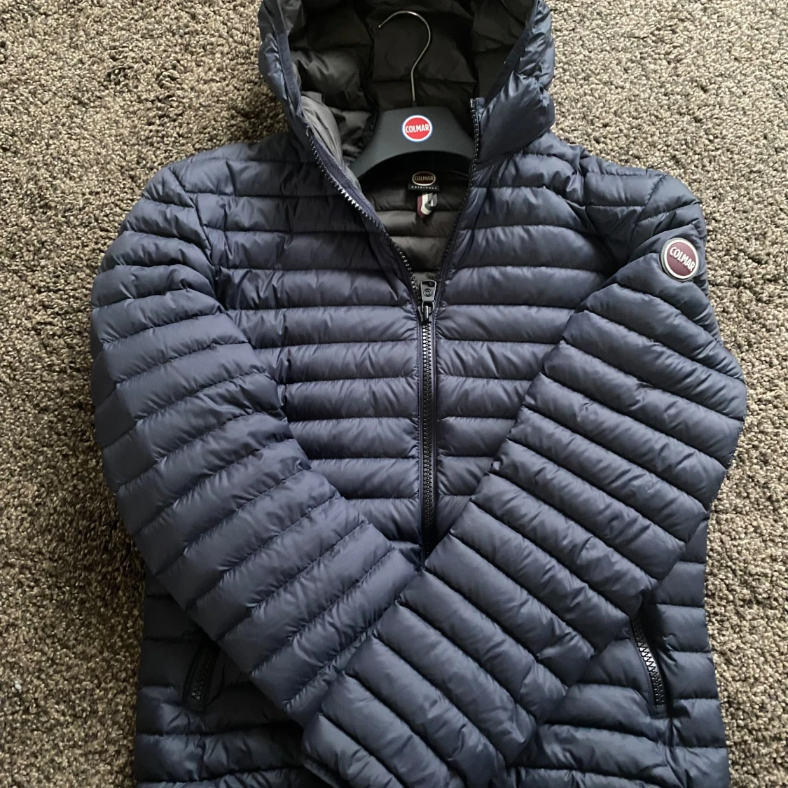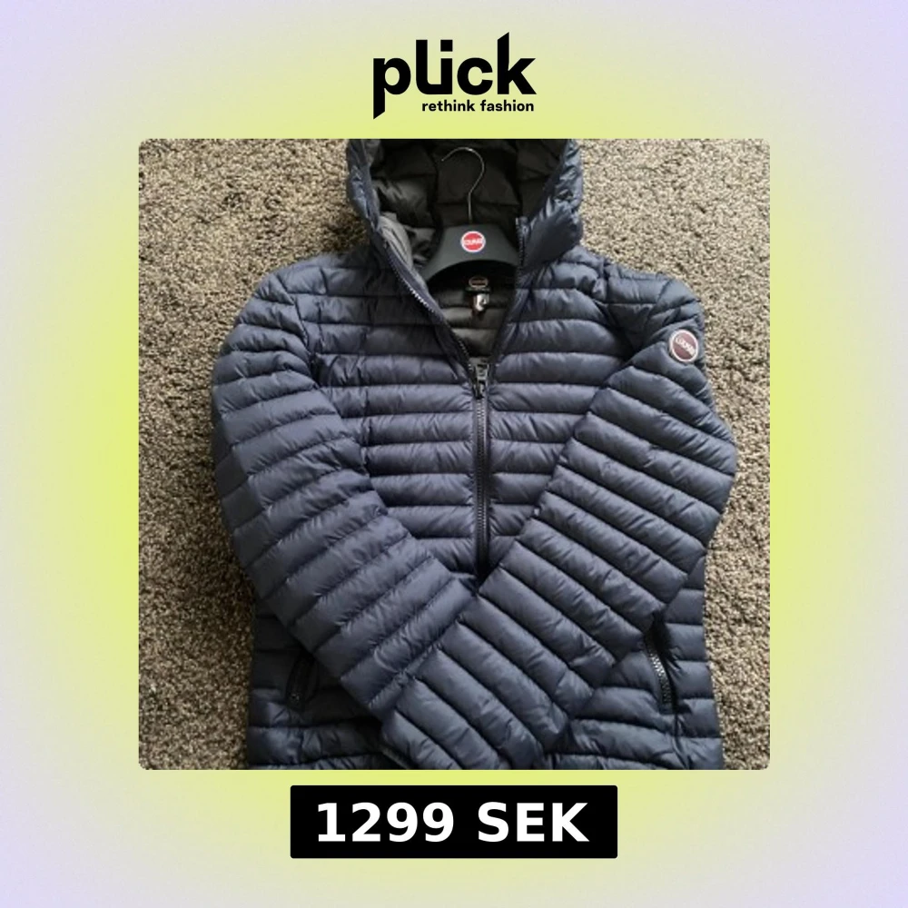 Säljer en snygg mörkblå jacka från Colmar. Jackan har en quiltad design med dragkedja och huva. Storlek 48 vilket motsvarar storlek (S)