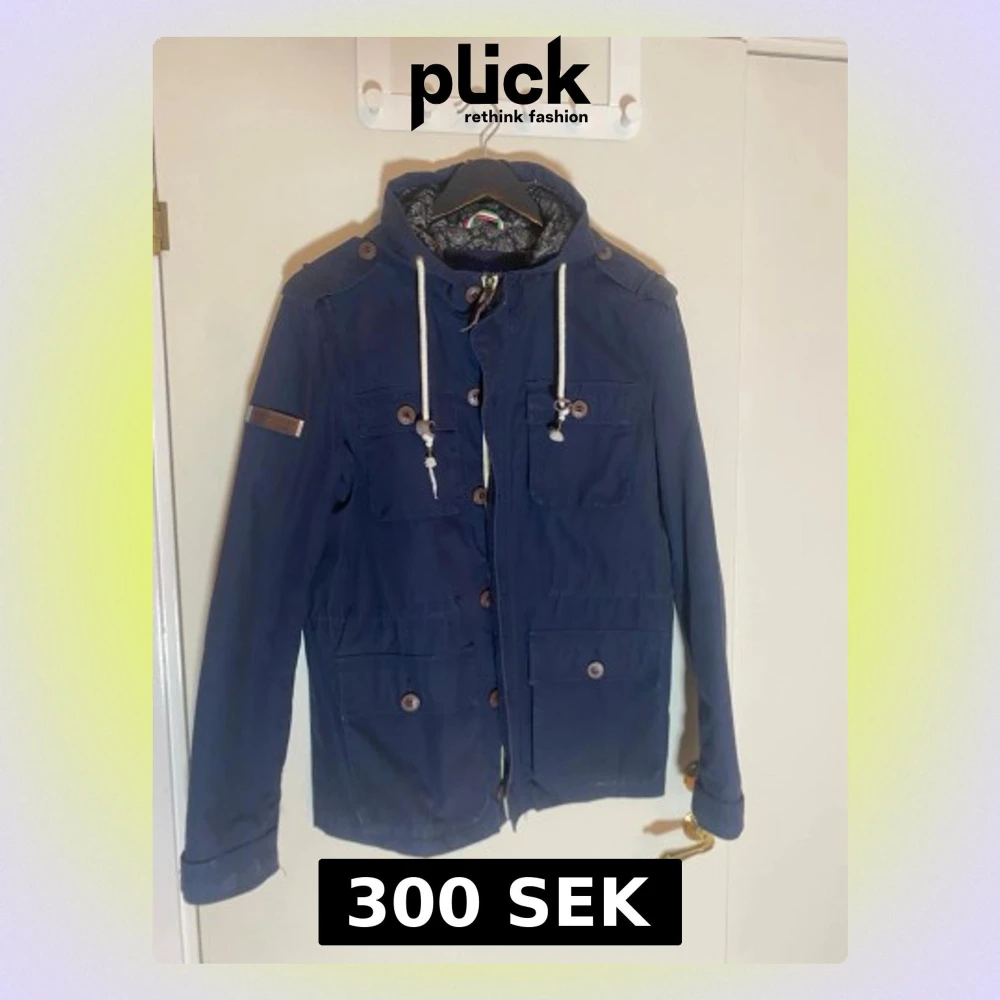 Snygg mörkblå jacka från Denimize med huva och vita snören. Jackan har flera fickor med knappar, dragkedja och coola detaljer som axelknappar. Yttertyg i bomull och fodrad med mönstrad polyester. Perfekt för dig som gillar still och funktion.