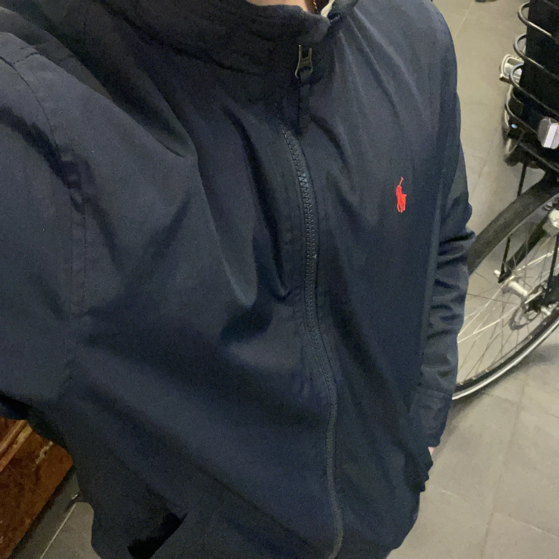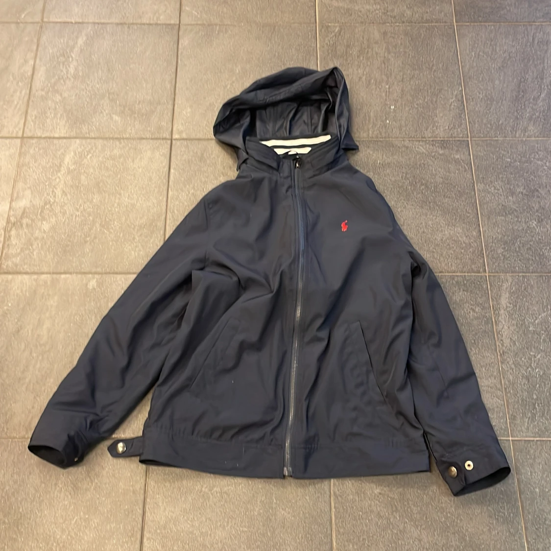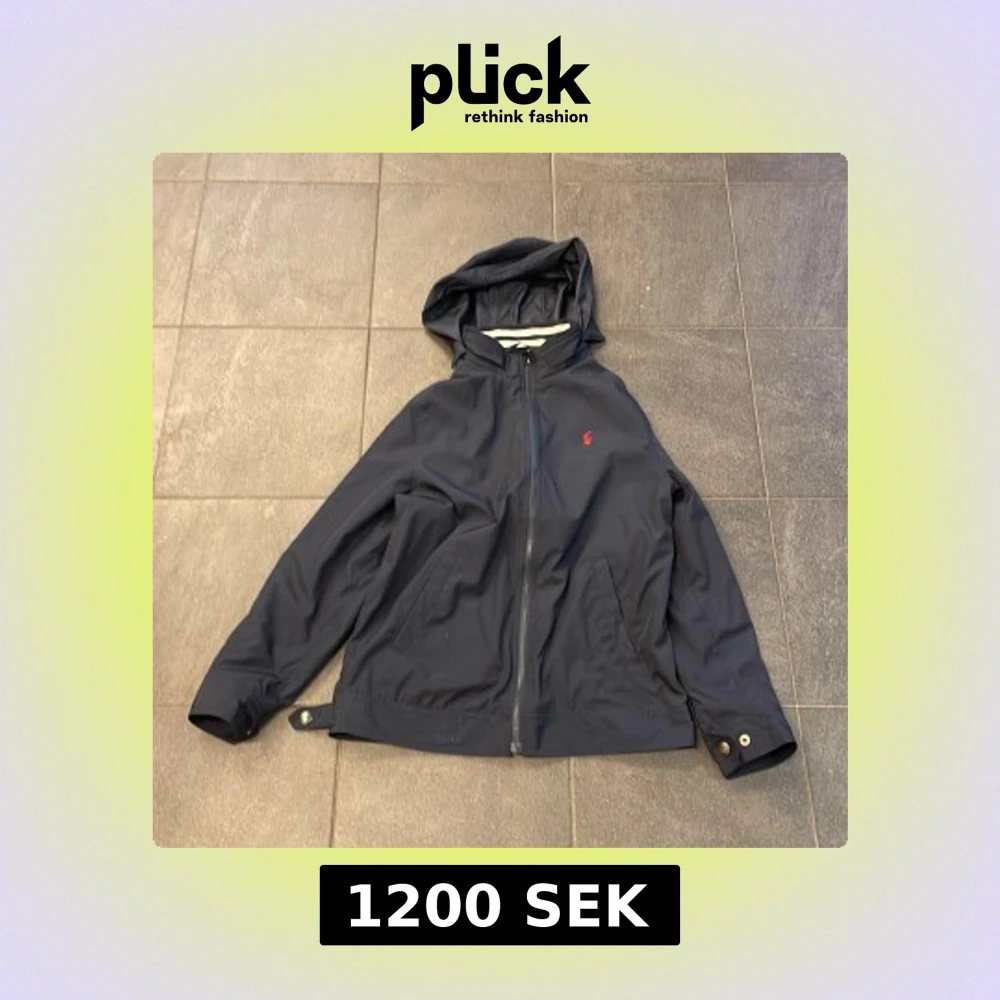 Säljer en stilren mörkblå jacka från Ralph Lauren med huva och dragkedja. Jackan har en liten röd logotyp på bröstet och justerbara knappar vid ärmslut och nederkant. Perfekt för en casual look. Large(14-16) XS herr