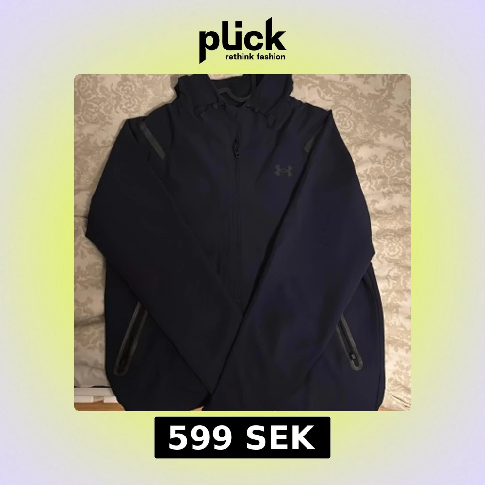 Säljer en mörkblå jacka från Under Armour med dragkedja och huva. Jackan har långa ärmar och praktiska fickor med dragkedjor. Perfekt för sportiga aktiviteter eller vardagsbruk.