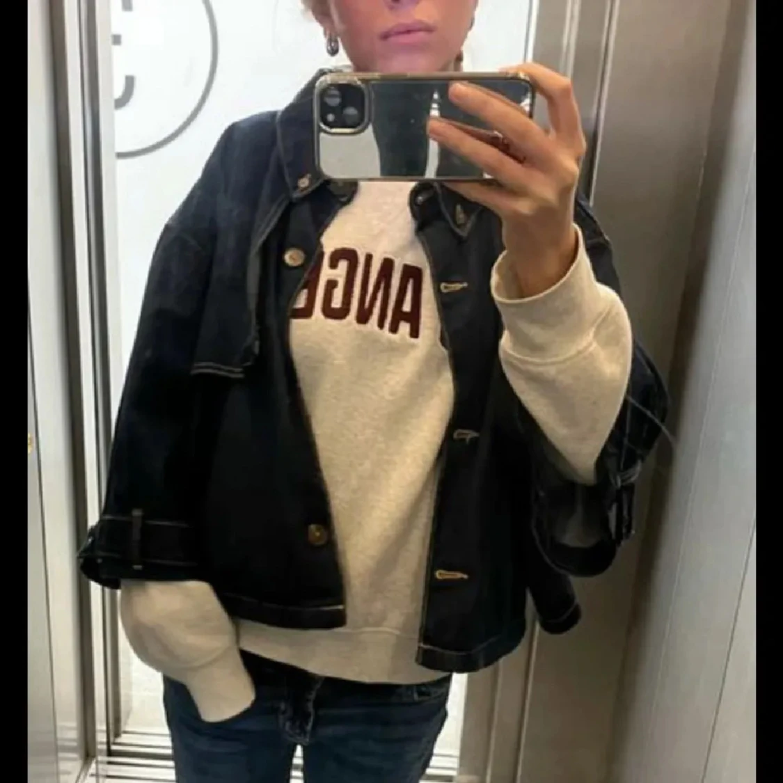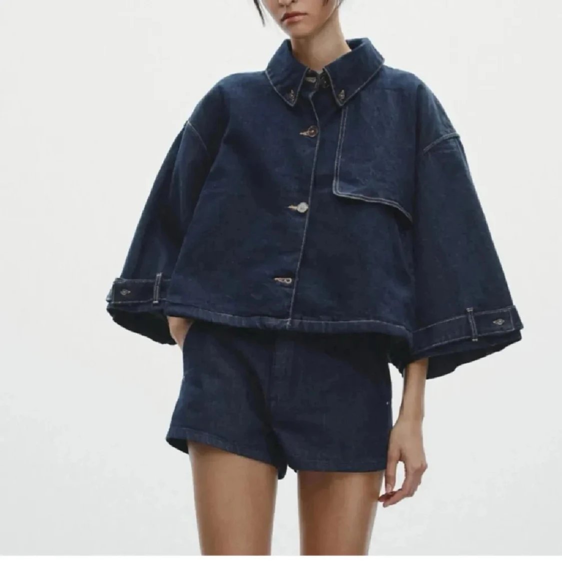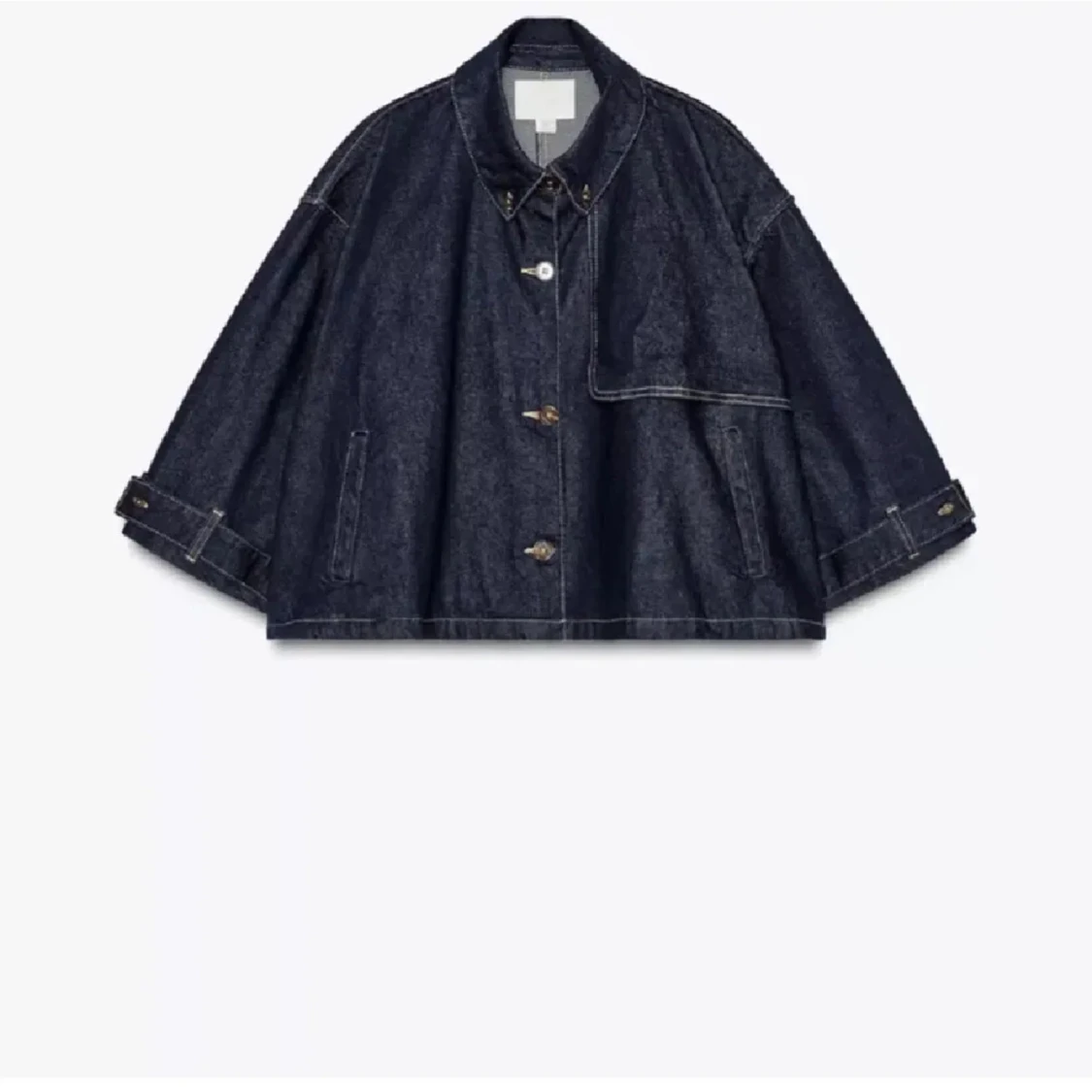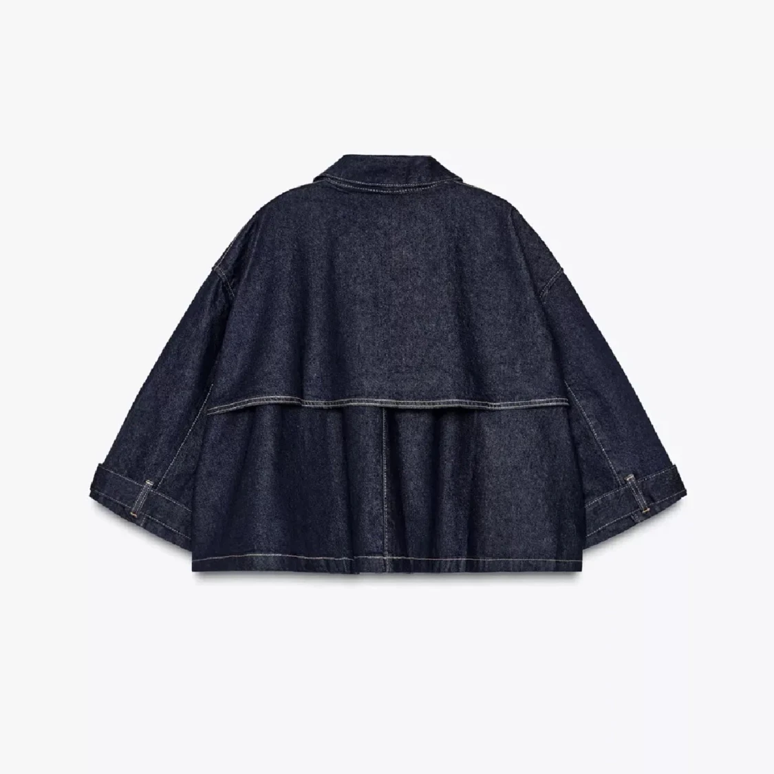 Säljer den populära jeansjackan i mörkblå denim med bred passform och trekvartsärmar från Zara. Poncho, trenchcoat, jacka. har klassisk krage, knäppning framtill med metallknappar och en unik asymmetrisk bröstficka. Från Zara slutsåld