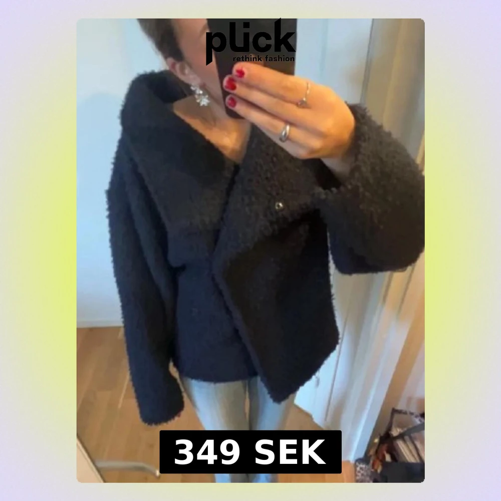 Säljer en svart teddyjacka med stor, asymmetrisk krage och breda ärmar. Jackan har en loose passform och stängs med knappar framtill. Perfekt för dig som gillar en chill och trendig look under höst och vinter.