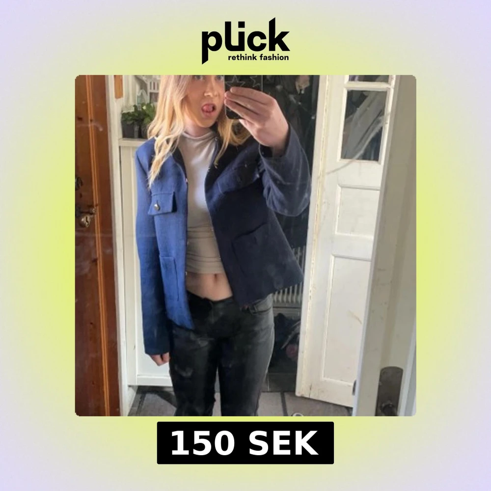Säljer en mörkblå kappa med två stora fickor framtill och knappar. Jackan har en rak passform och är långärmad men fortfarande tunn, perfekt för en stilig outfit! (Intressekoll)