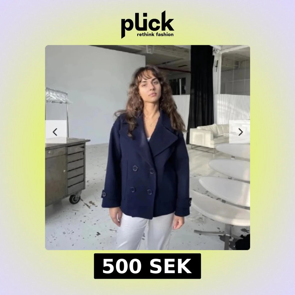 Snygg mörkblå kappa med dubbelknäppning och bred krage från design by si. Perfekt för kyligare dagar. Skriv för egna bilder