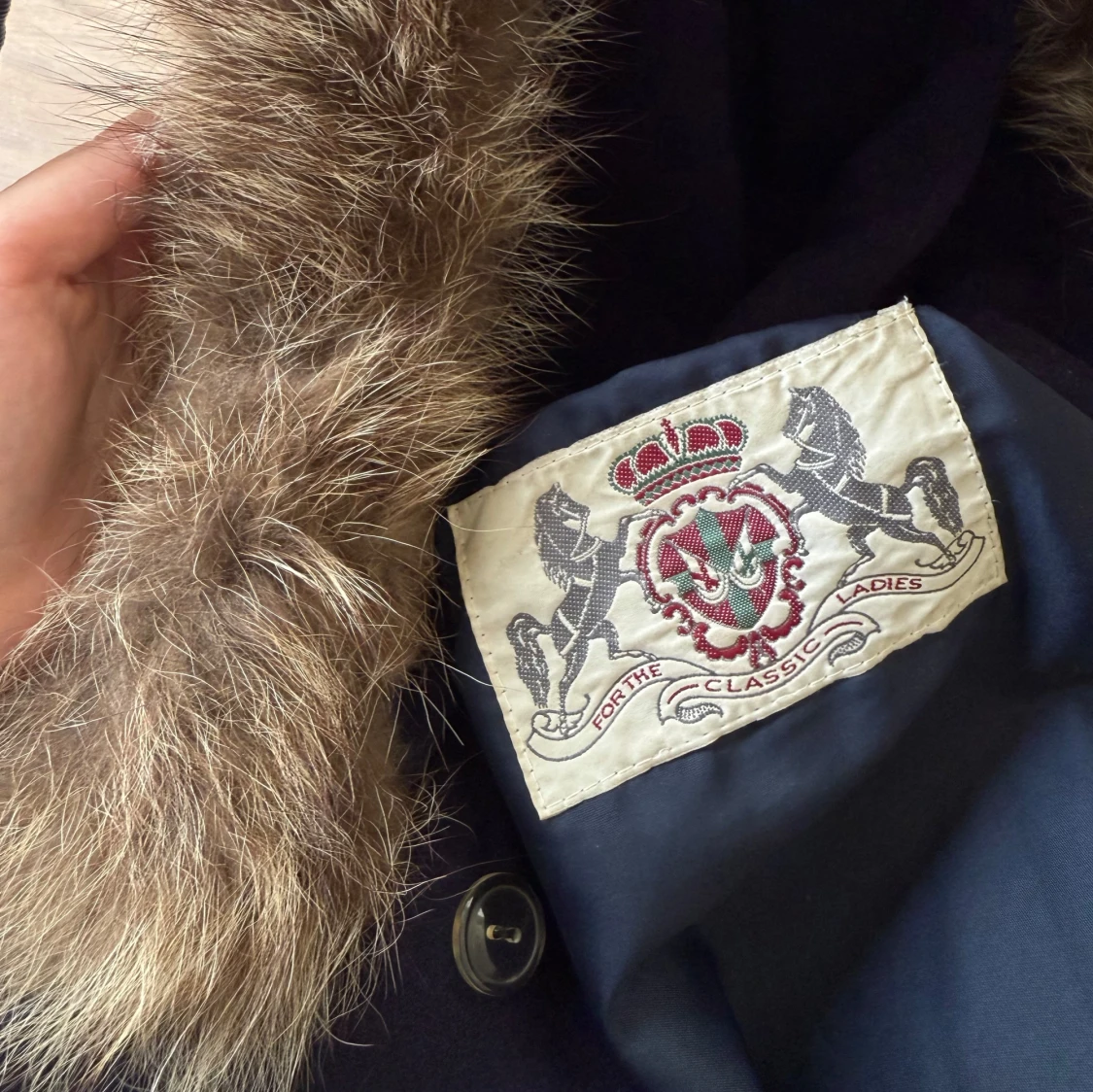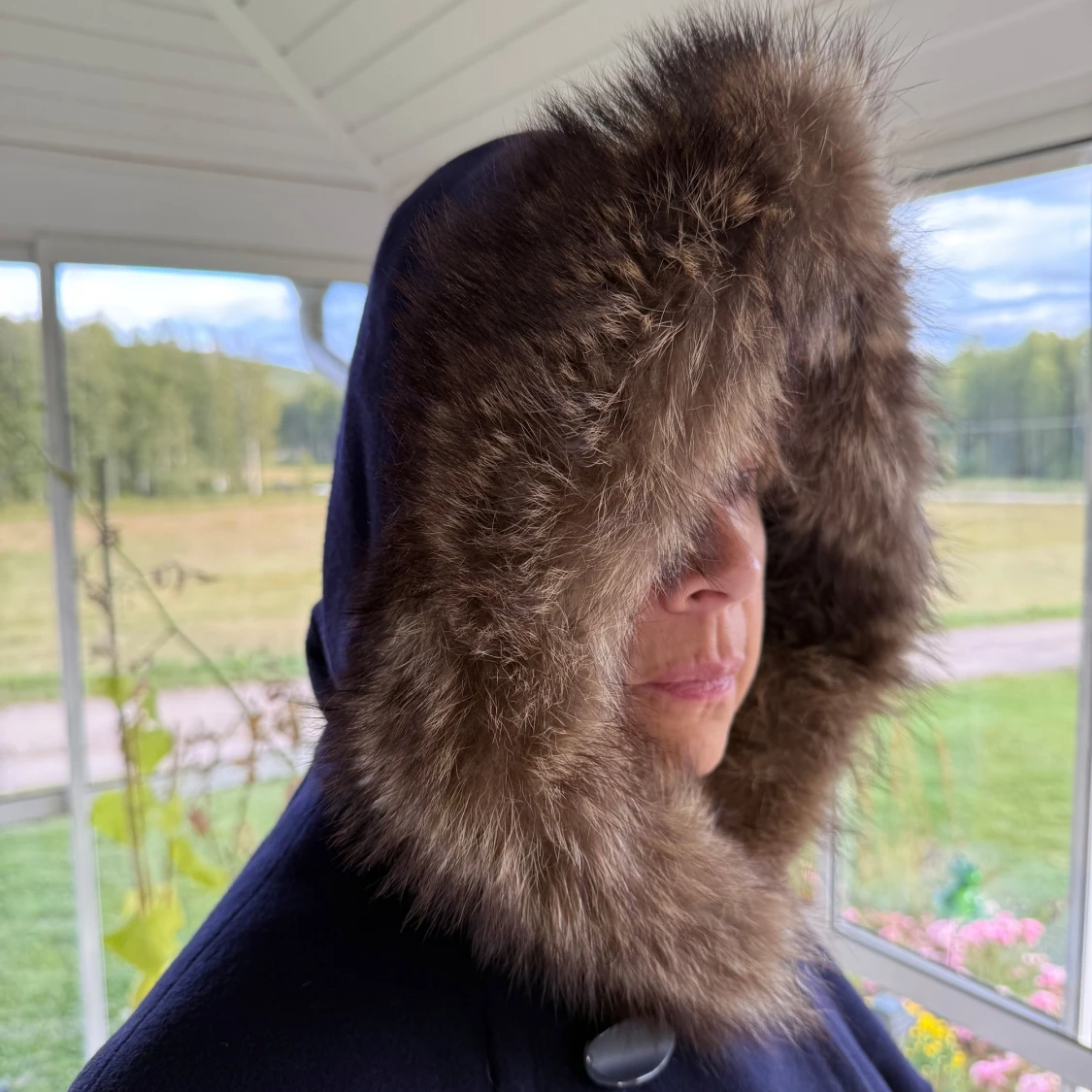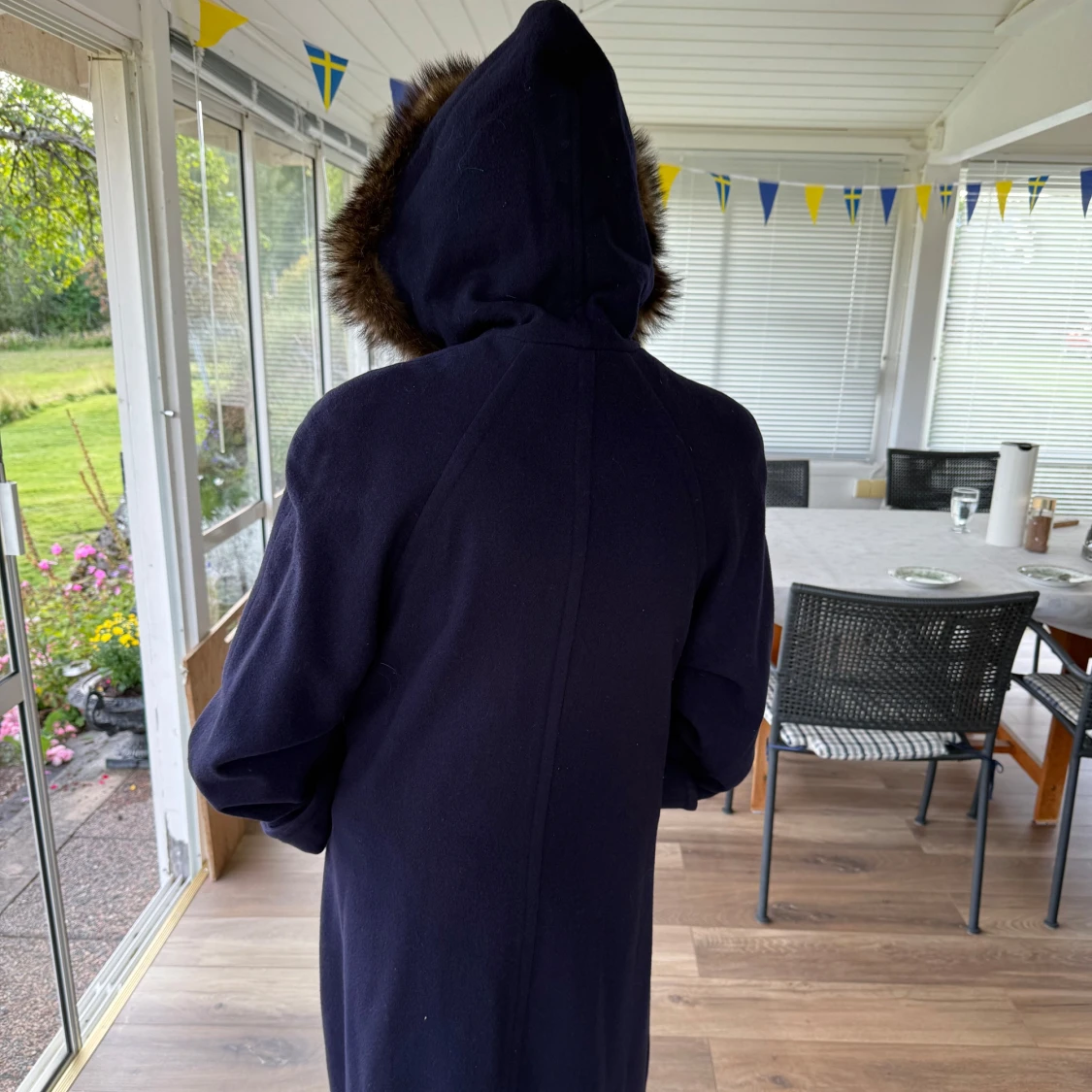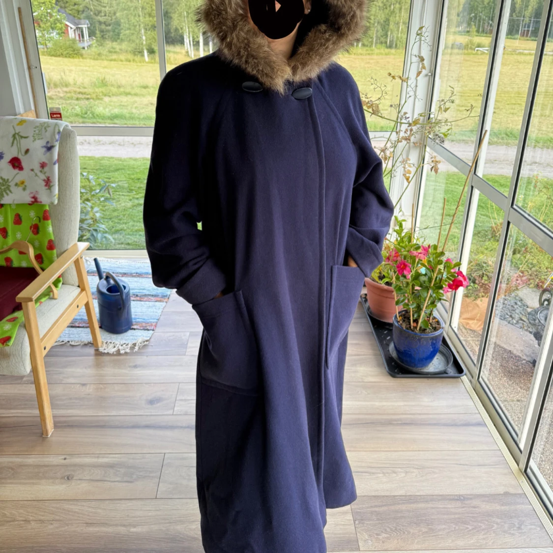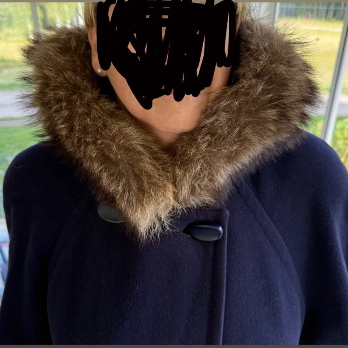 100% ull och äkta päls. Kappan har två stora fickor framtill och stängs med snygga knappar.
