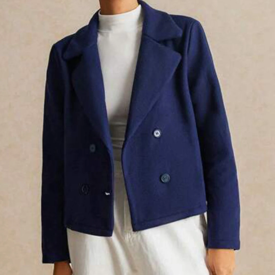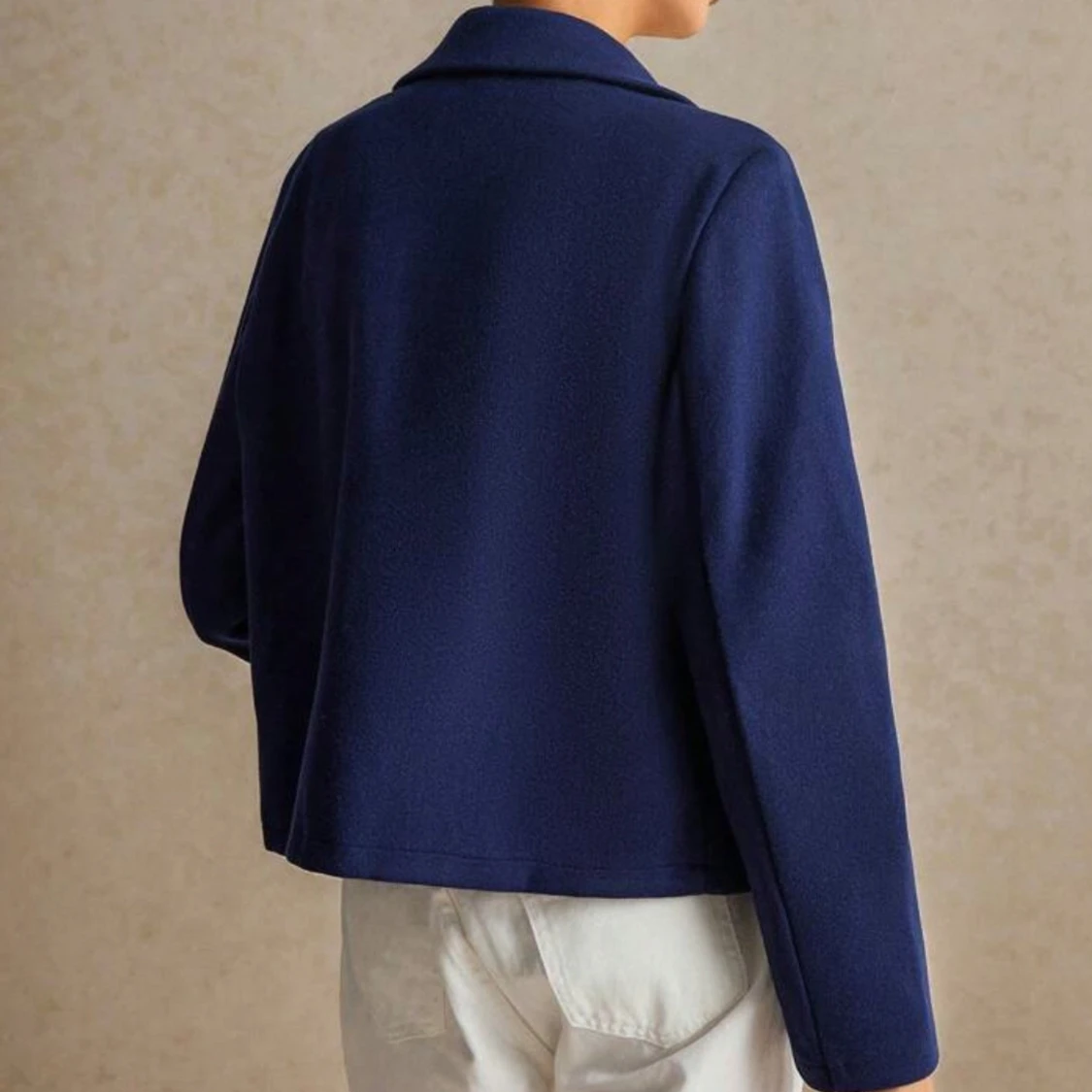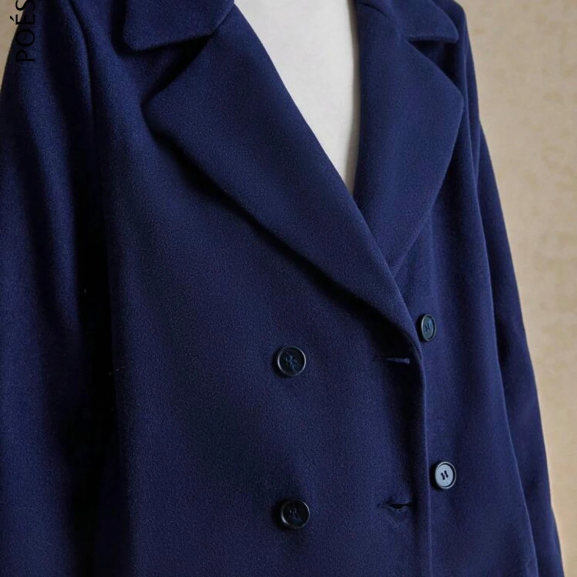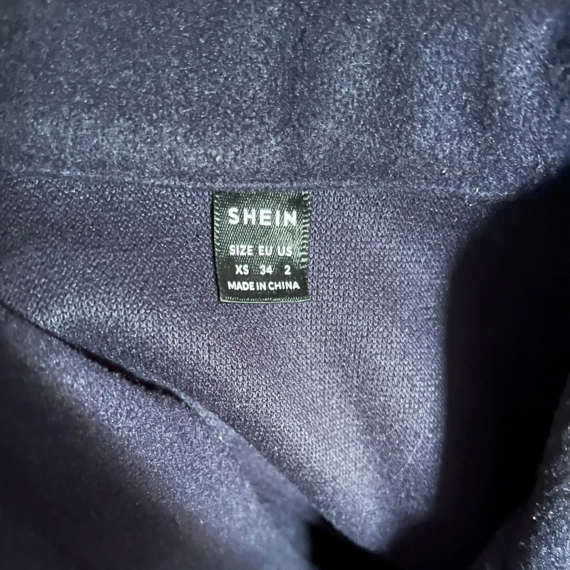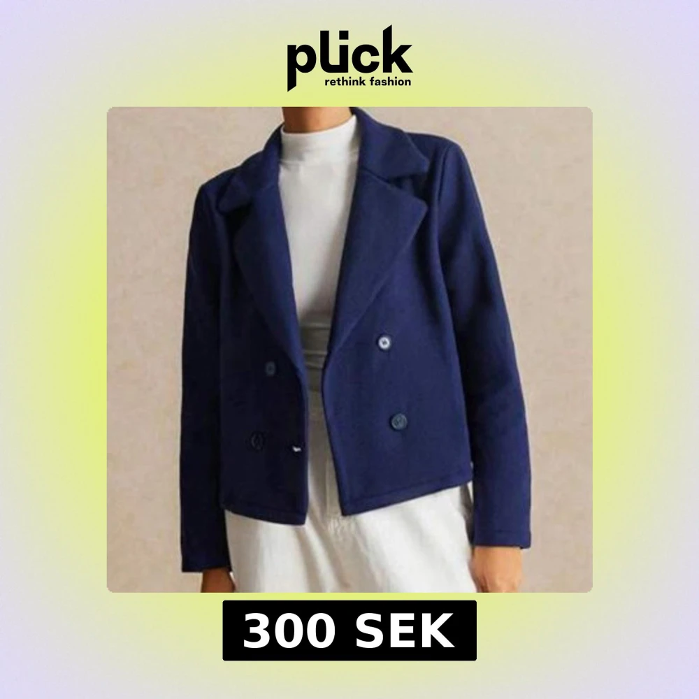 Snygg mörkblå kavajjacka från SHEIN i kortare modell med dubbelknäppning och klassisk krage. Jackan har långa ärmar och är tillverkad i ett mjukt material som känns lite ulligt. Perfekt för dig som vill ha en stilren och trendig look.