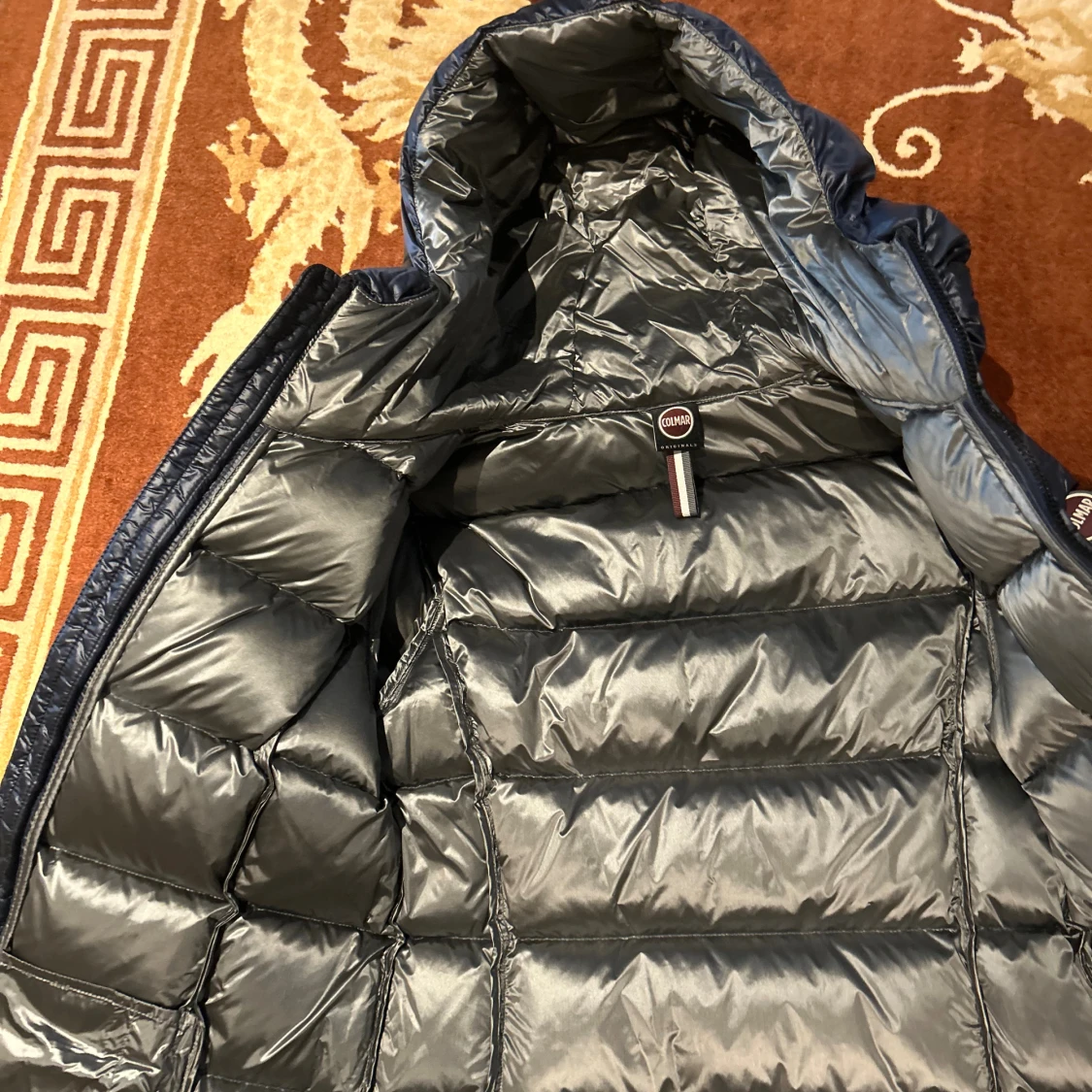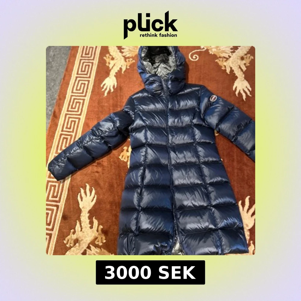 Säljer en ny mörkblå , lång dunjacka från Colmar som endast är använd 2-3 gånger med huva och snygg glansig finish. Jackan har quiltad design, dragkedja framtill och logotyp på ärmen. Perfekt för kalla dagar och har en riktigt schysst oversized look.
