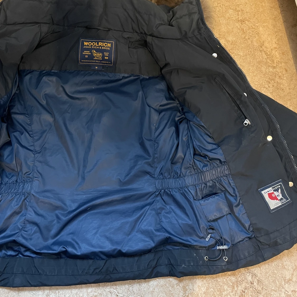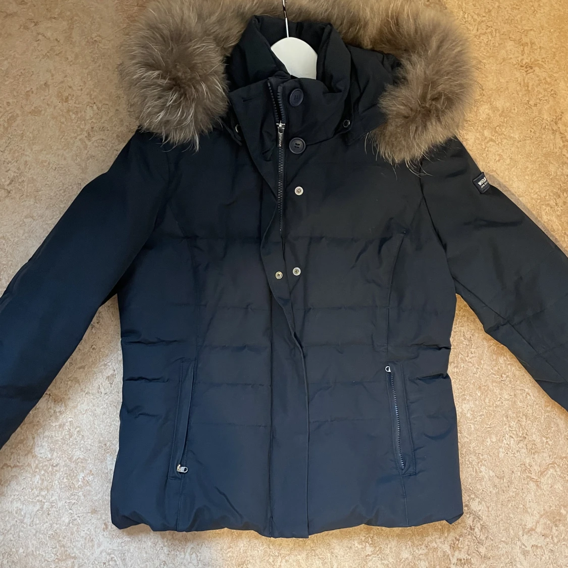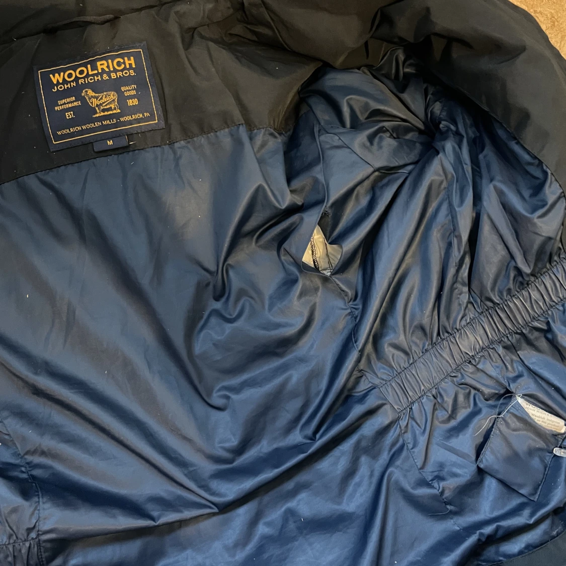 Woolrich jacka i kort modell, mörkblå, avtagbar luva och pälskrage. Matt utsida. Varm! Sparsamt använd, dock har en söm i fodret gått upp (se bild), påverkar ej funktionen och som nog är enkelt att fixa. Bra skick! Säljes pga för liten. Tts
