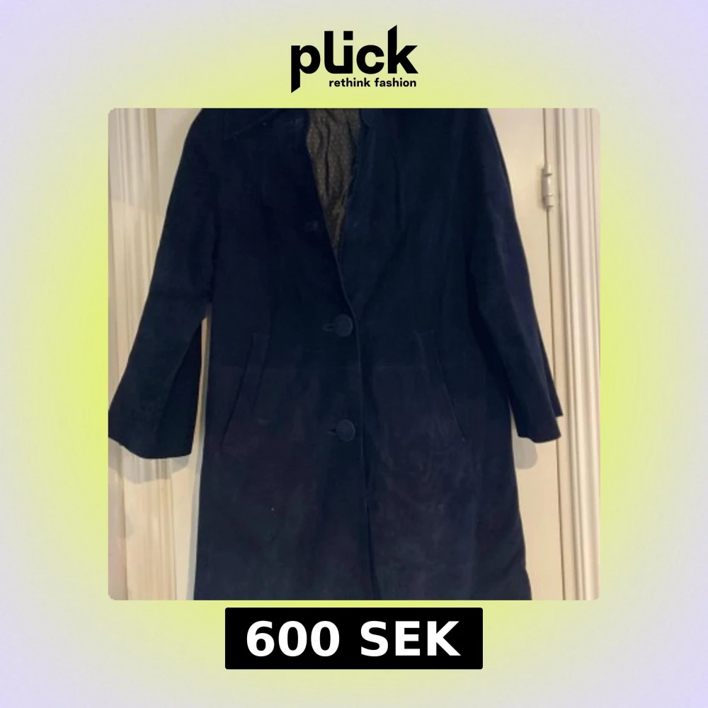 Snygg lång mörkblå kappa i äkta getskinn från Malung Skinnkläder. Klassisk rak modell med stora knappar framtill, En knapp har lossnat men finns kvar. Sömmen under ena armhålan har gått upp. Se bild
