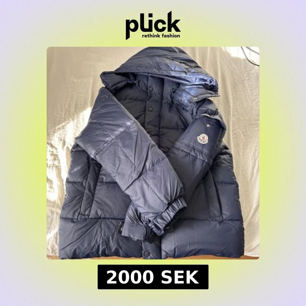 Säljer en mörkblå pufferjacka från Moncler med huva och klassisk logga på ärmen. Jackan är quiltad och har dragkedja samt knappar framtill. Perfekt för kalla dagar och riktigt snygg streetstil.