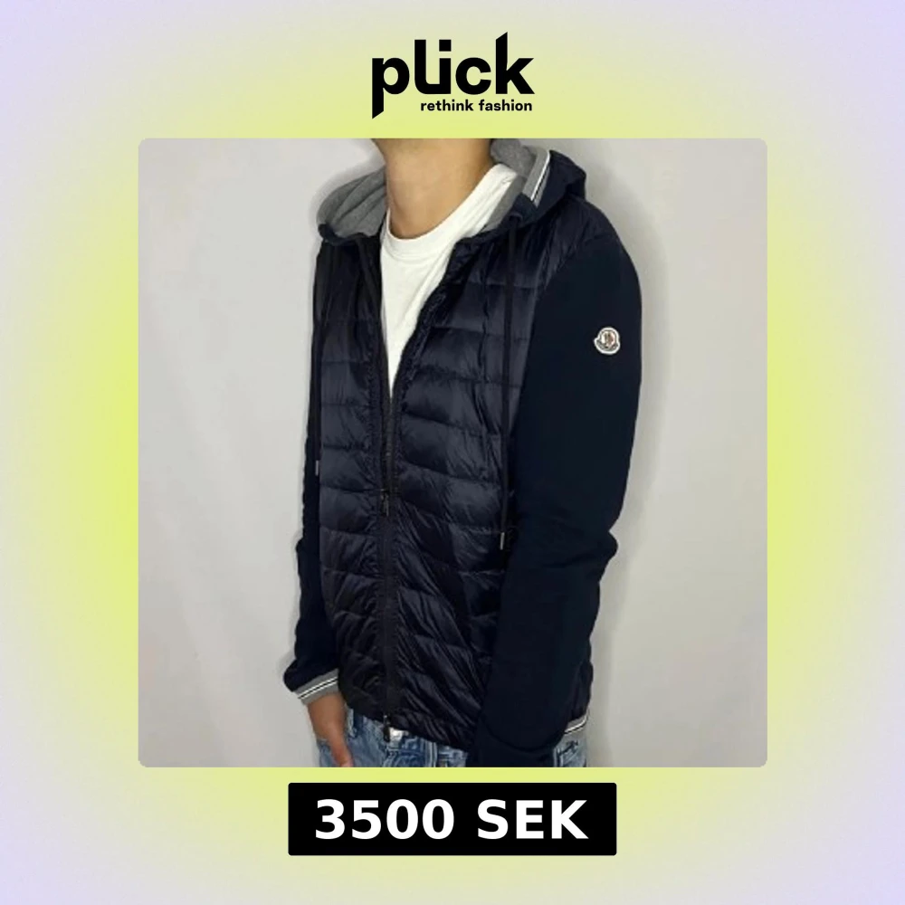 Snygg mörkblå cardigan från Moncler med quiltad front, mjuka stickade ärmar och grå huva. Jackan har dragkedja, snörning vid huvan och Moncler-logga på ärmen. ÄKTA! Storlker L men passar M