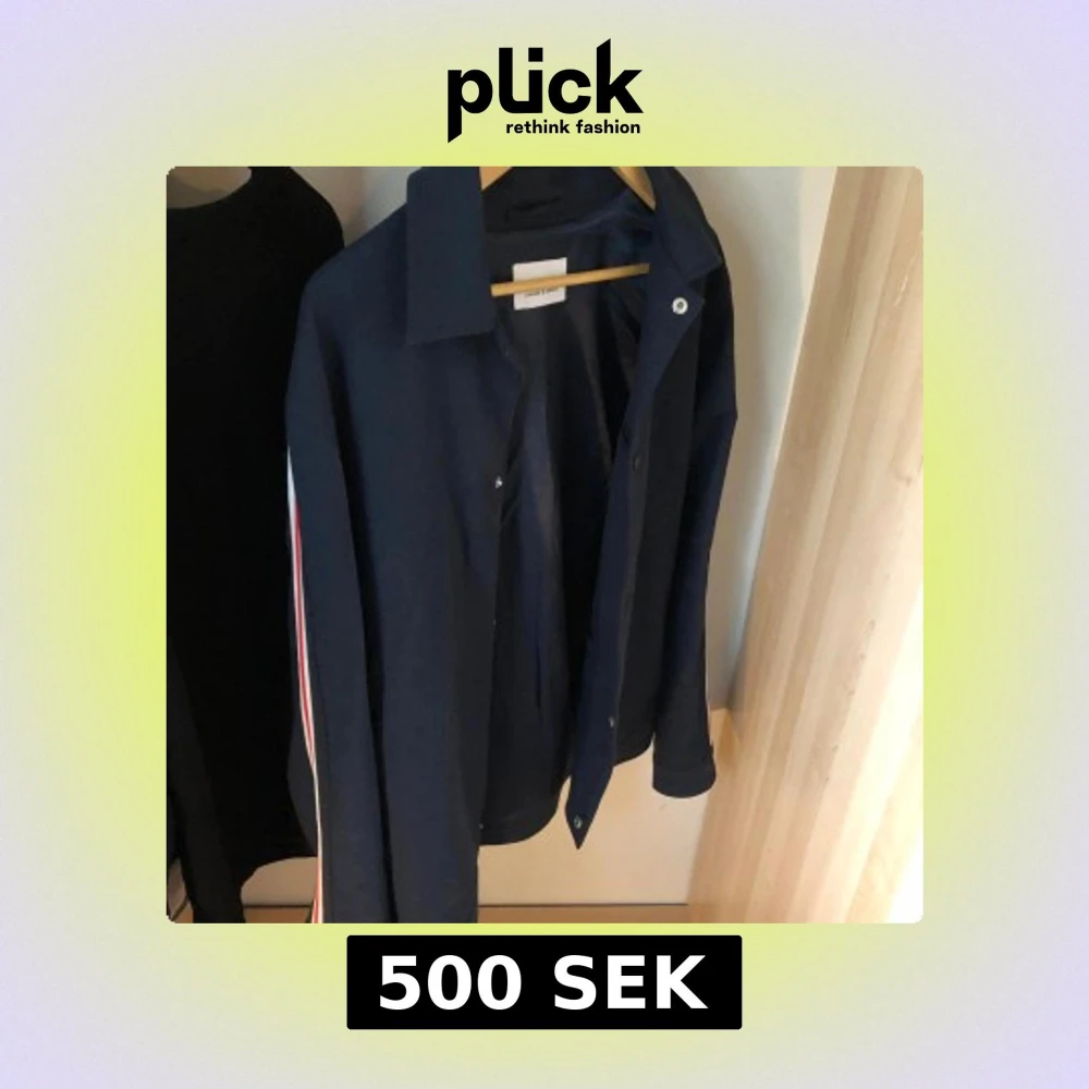 Snygg mörkblå overshirt från Samsøe Samsøe med vita och röda ränder längs ärmarna. Klassisk krage, knäppning framtill och lång ärm. Perfekt för dig som gillar stilrena plagg med sportig touch.