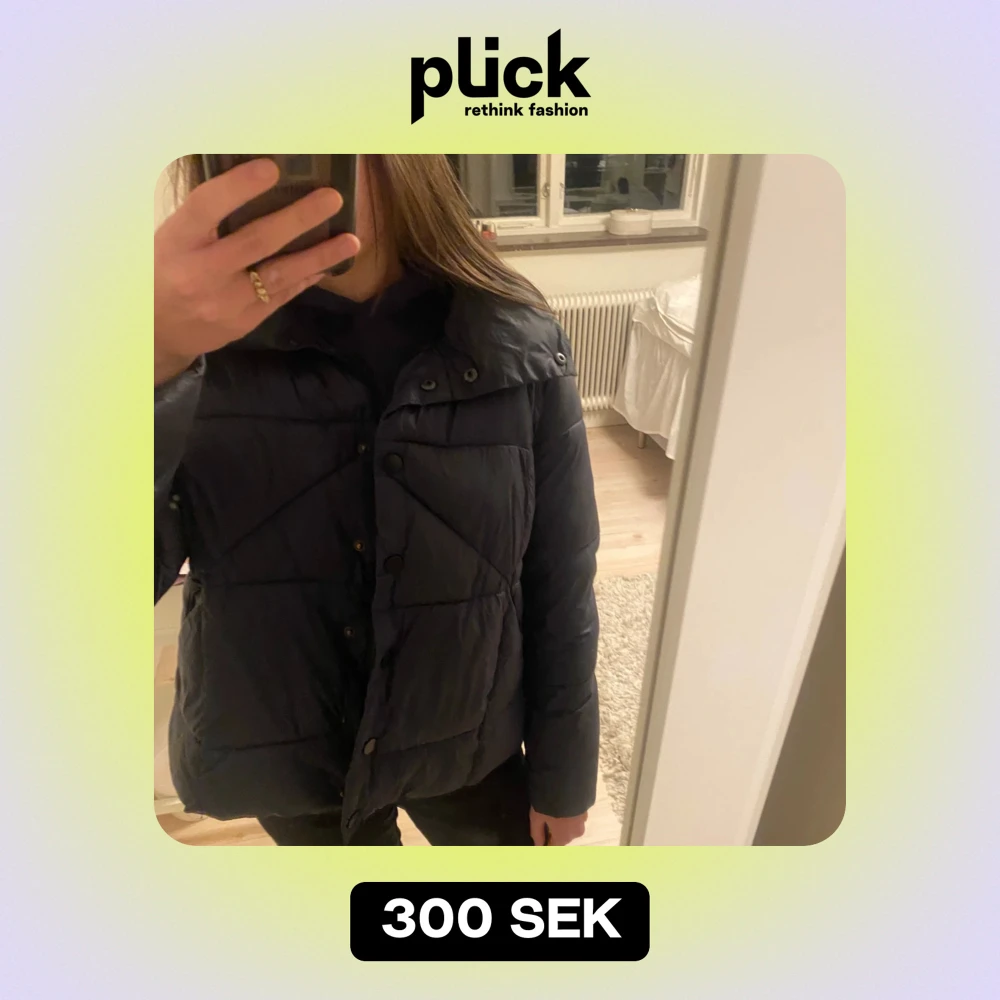 Säljer en snygg mörkblå pufferjacka med knappar och hög krage som går att vika ner. Priset går att diskutera vid snabbaffär. Storlek L men passar mig som är en S! Originalpris runt 1200 kr.