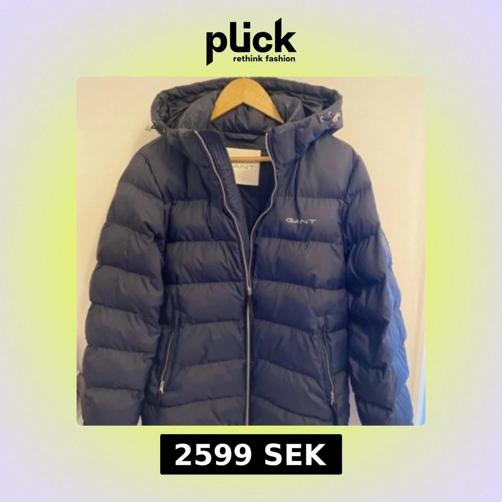 Snygg mörkblå pufferjacka från GANT med huva och dragkedja framtill. Jackan har två fickor med dragkedja och broderad GANT-logga på bröstet. Perfekt för kyliga dagar och riktigt skön att bära.