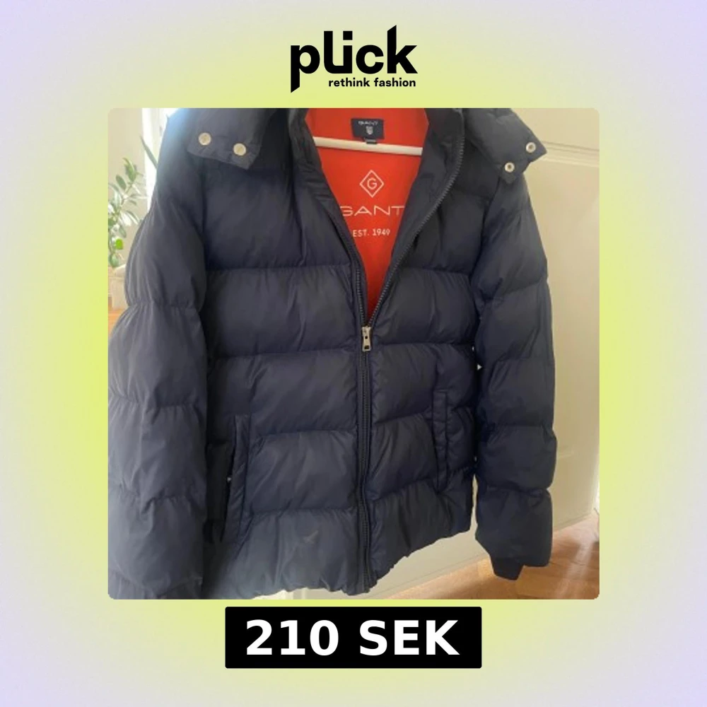 Mörkblå vinterjacka från GANT strl 158-164( 13-14 år) med orange foder. Jackan har huva med tryckknappar, två sidofickor och dragkedja framtill. Ett litet hål har lagats med en patch, syns knappt vid användning. Annars inga skador eller märken.