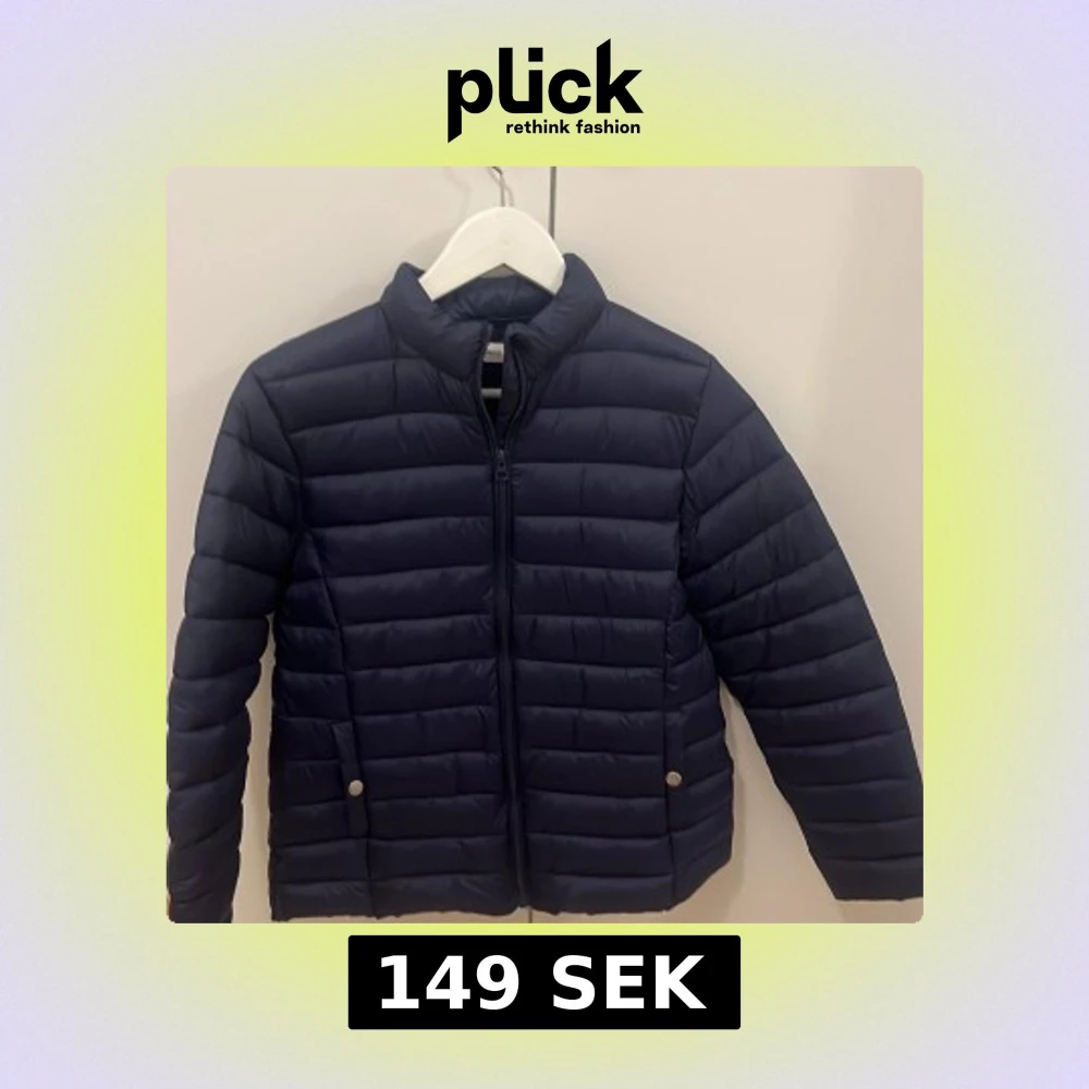 Snygg mörkblå pufferjacka från MNG med horisontella sömmar och dragkedja framtill. Jackan har två fickor med tryckknappar och står upp lite i kragen.