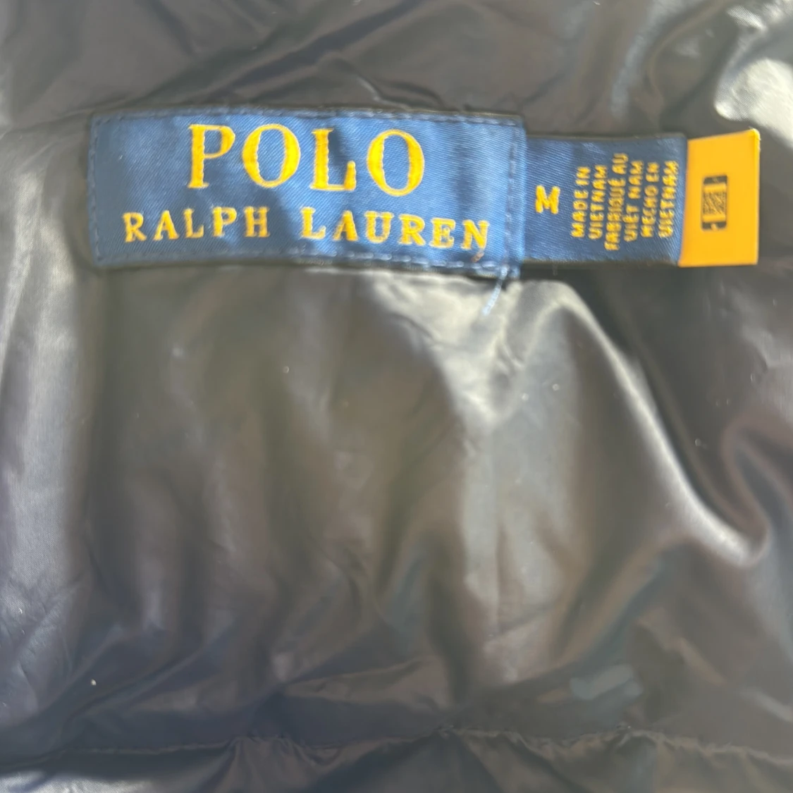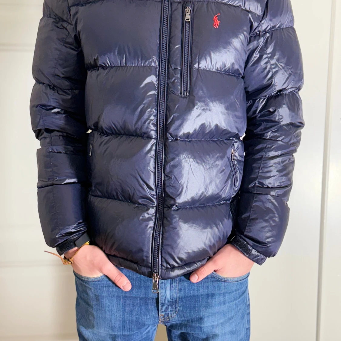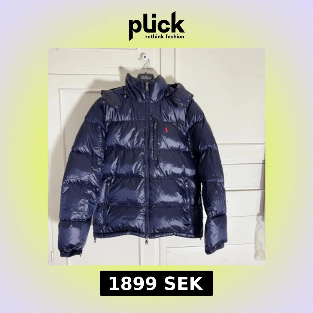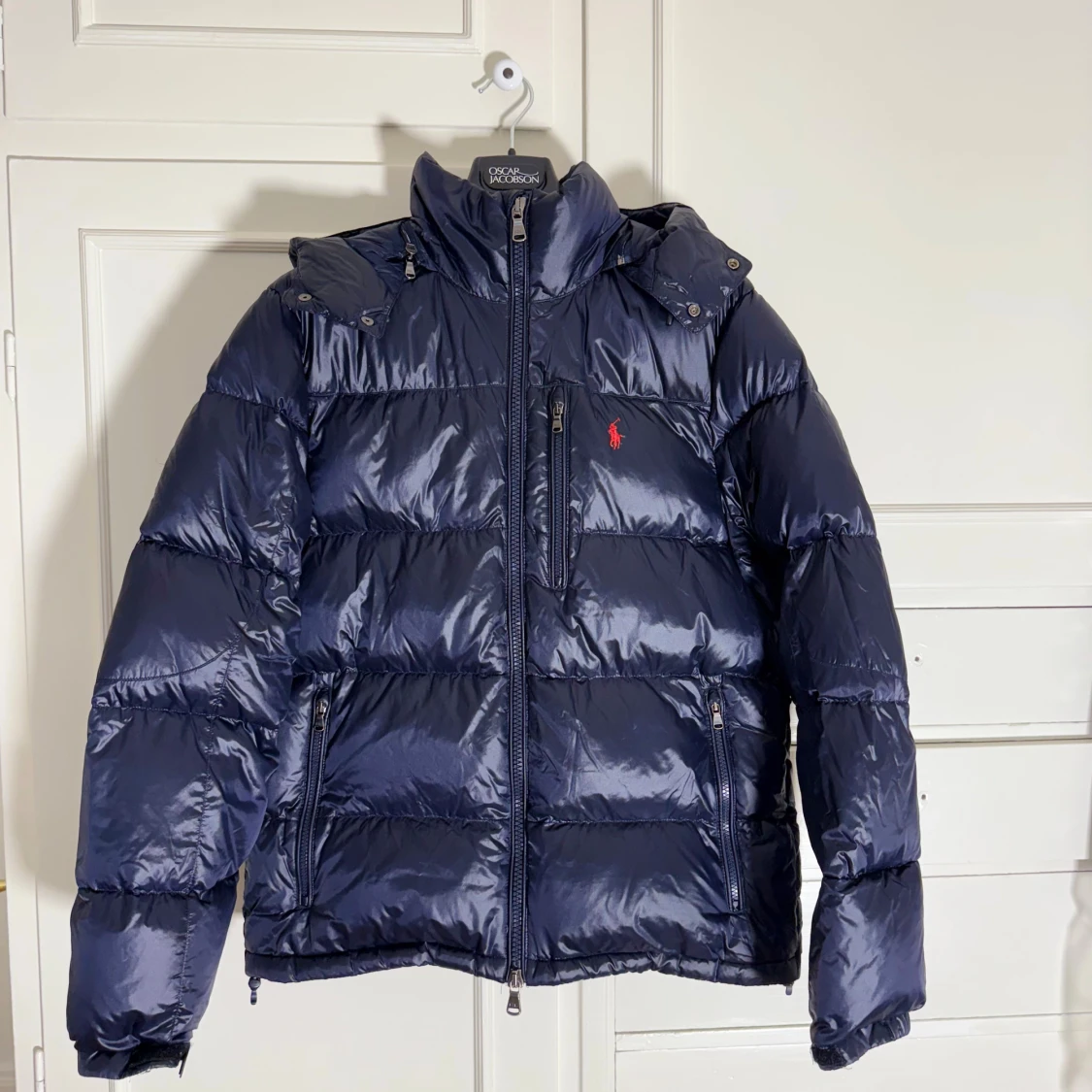 Säljer en mörkblå pufferjacka från Polo Ralph Lauren med glansig finish och röd logga på bröstet. Jackan har huva, tre dragkedjefickor framtill och kraftig vaddering som håller dig varm. Perfekt för kalla dagar och riktigt snygg till jeans.