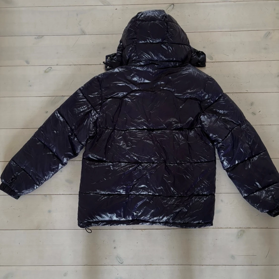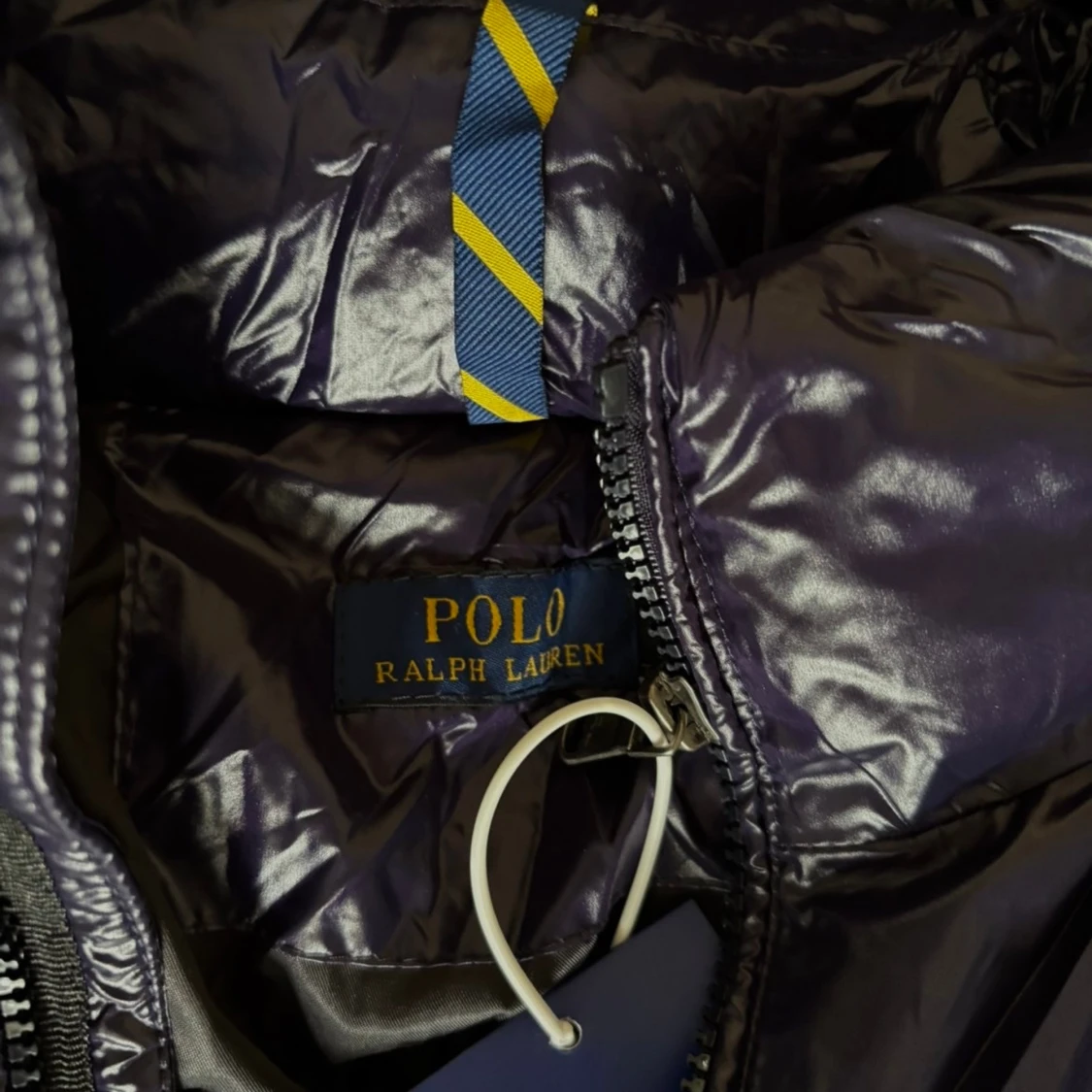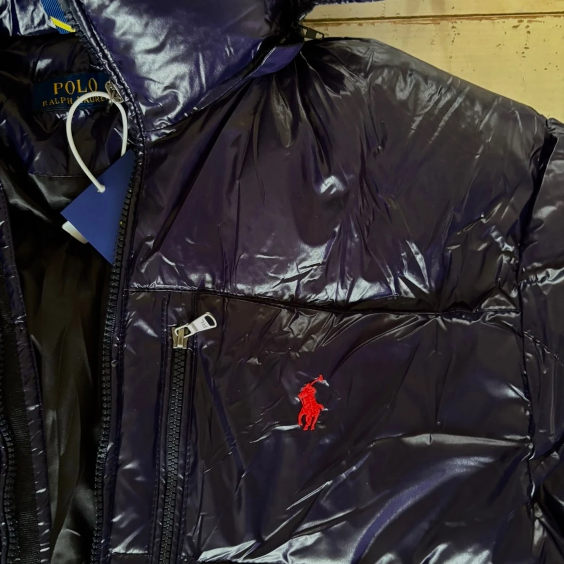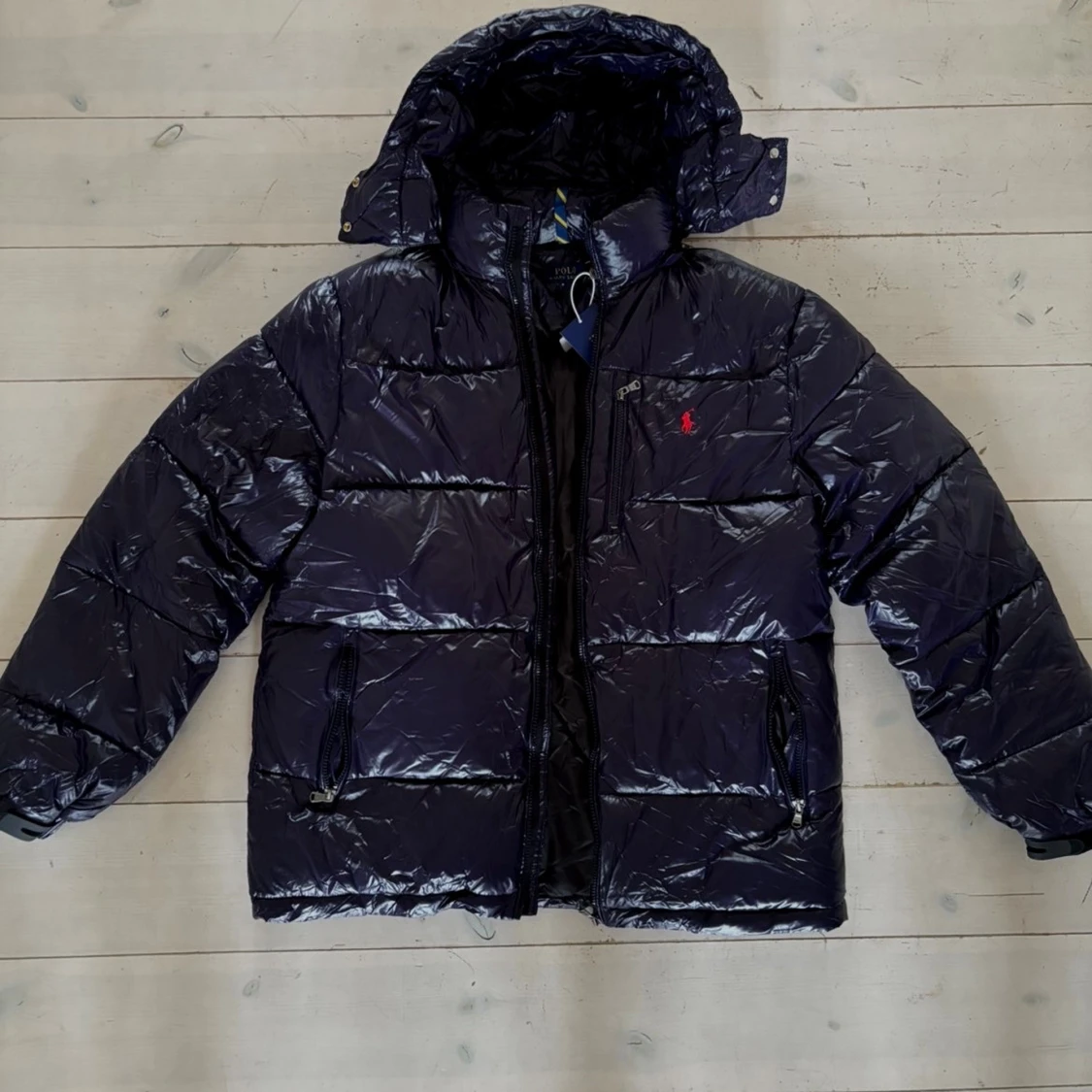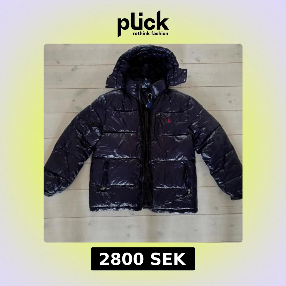 Säljer en mörkblå pufferjacka från Polo Ralph Lauren med glansig finish och röd broderad logga på bröstet. Jackan har huva, dragkedja framtill och praktiska fickor med dragkedja.