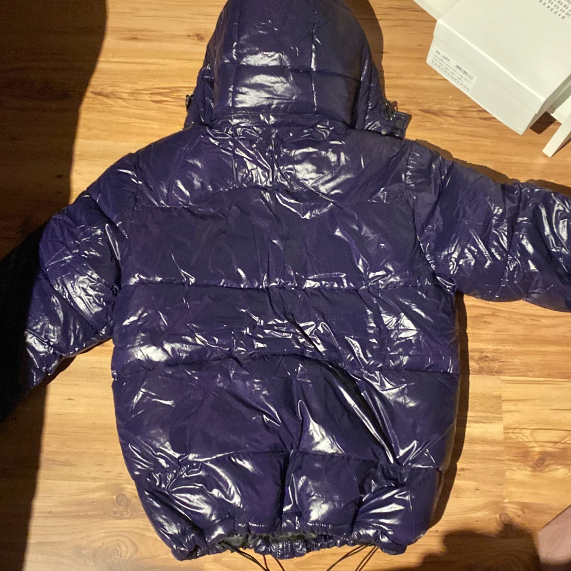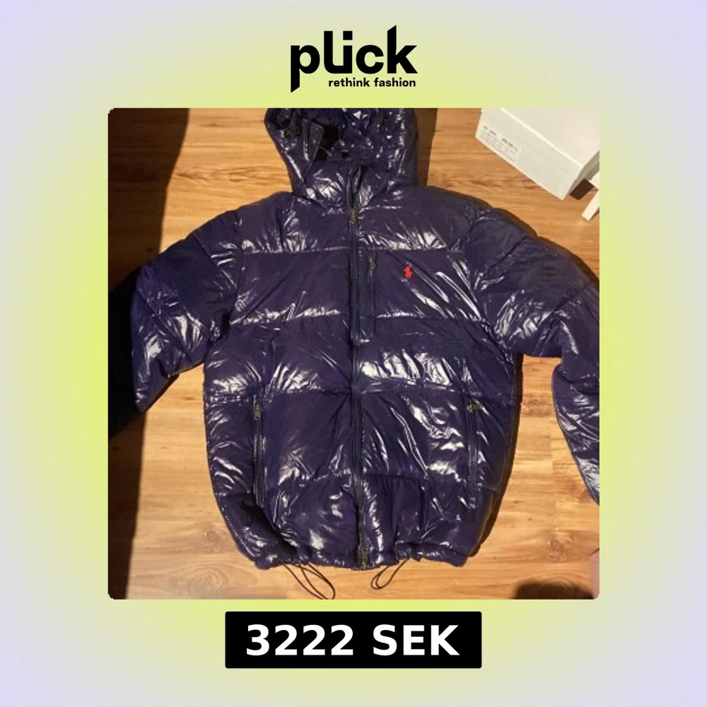 Säljer en mörkblå, glansig pufferjacka från Polo Ralph Lauren med huva och dragkedja framtill. Jackan har två sidofickor med dragkedja och justerbar nederkant med snörning. Klassisk röd Polo-logga på bröstet. Perfekt för kalla dagar.