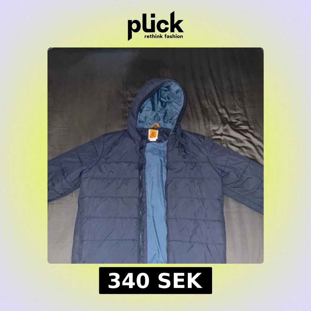 Säljer en mörkblå pufferjacka från Timberland med huva och broderad logga på bröstet. Jackan har dragkedja framtill och är quiltad med horisontella sömmar. Insidan är ljusblå och materialet är syntet. Perfekt för kalla dagar.