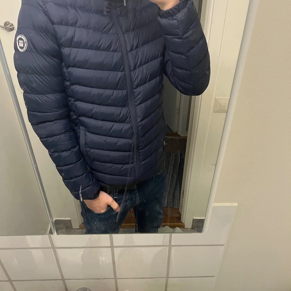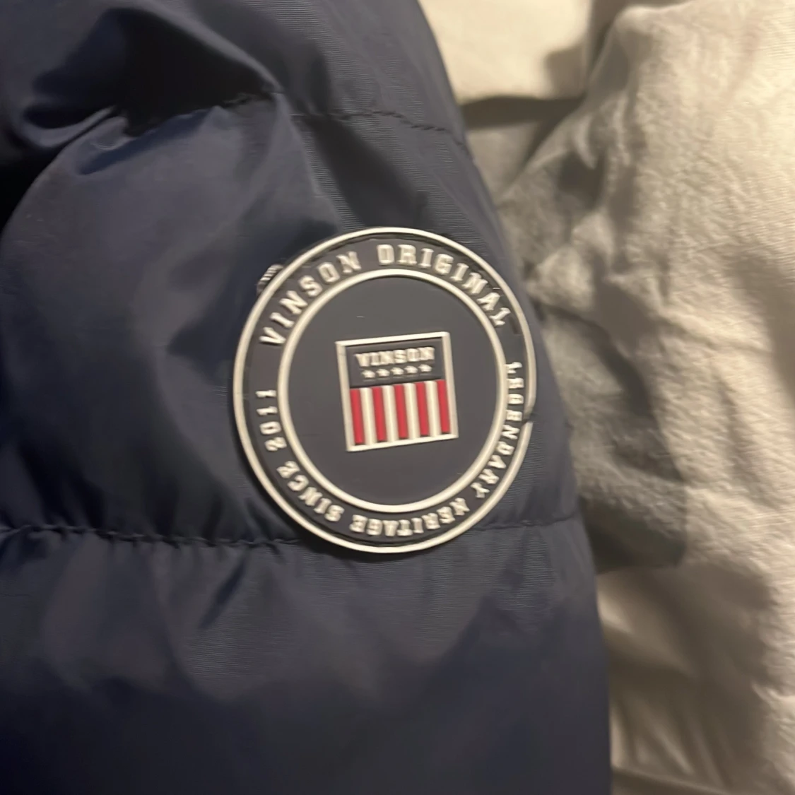 Säljer en mörkblå pufferjacka från Vinson med huva och snyggt märke på ärmen. Jackan har horisontella quiltade partier, dragkedja framtill och två sidofickor. Perfekt för dig som vill ha en stilren och varm jacka med modern look.