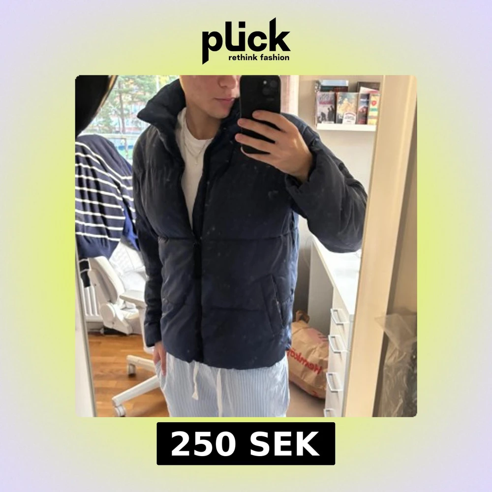 Säljer en mörkblå pufferjacka med hög krage och dragkedja framtill. Jackan har en clean look, två sidofickor och är perfekt för kyligare dagar. Passformen är normal och jackan är vadderad för extra värme. Märke ej synligt.