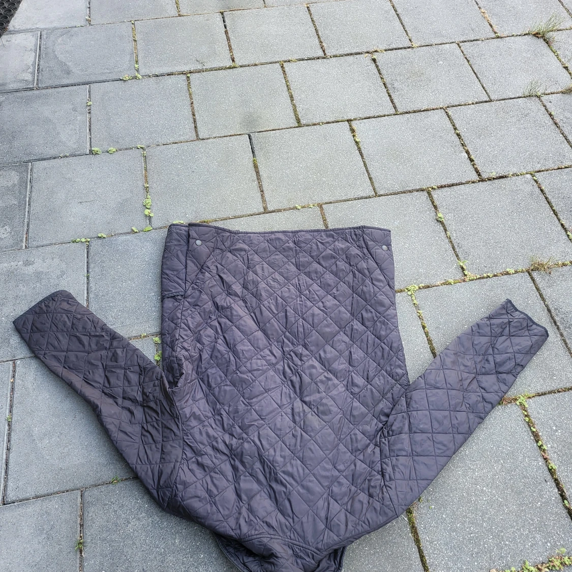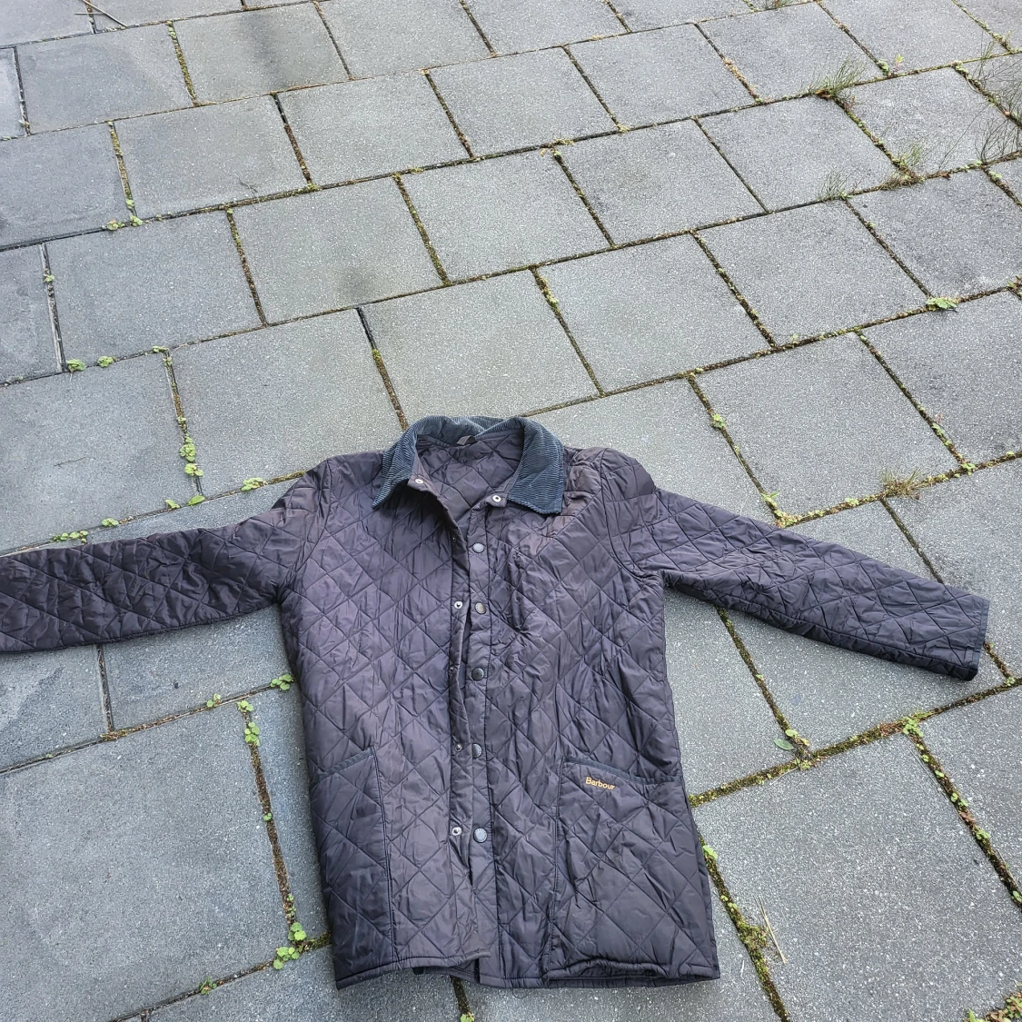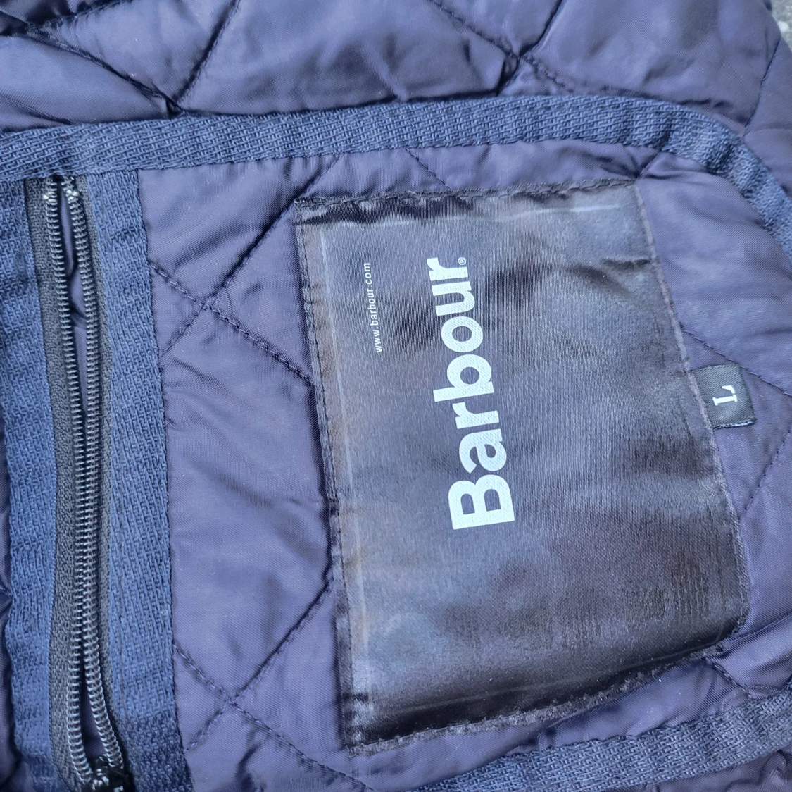 Quiltad mörkblå jacka från Barbour i storlek L. Klassisk modell med krage i manchester, tryckknappar framtill och diskret Barbour-logga på bröstet. Jackan har långärmad passform och rutmönster över hela ytan. Perfekt för dig som gillar stilren och tidlös look.