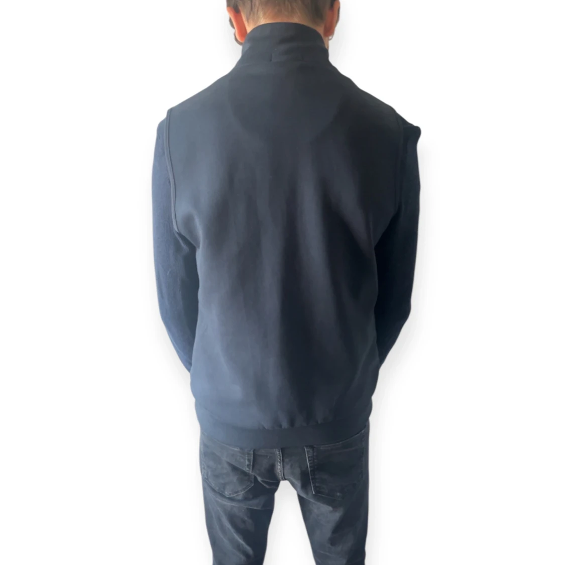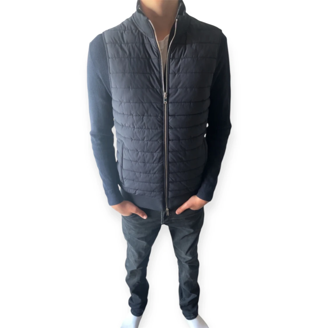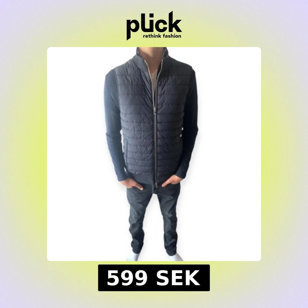 Snygg mörkblå dunväst med quiltad framsida och hög krage. Västen har hel dragkedja framtill och en stilren, enkel design utan synliga loggor. Perfekt att slänga över en hoodie eller tröja för extra värme.