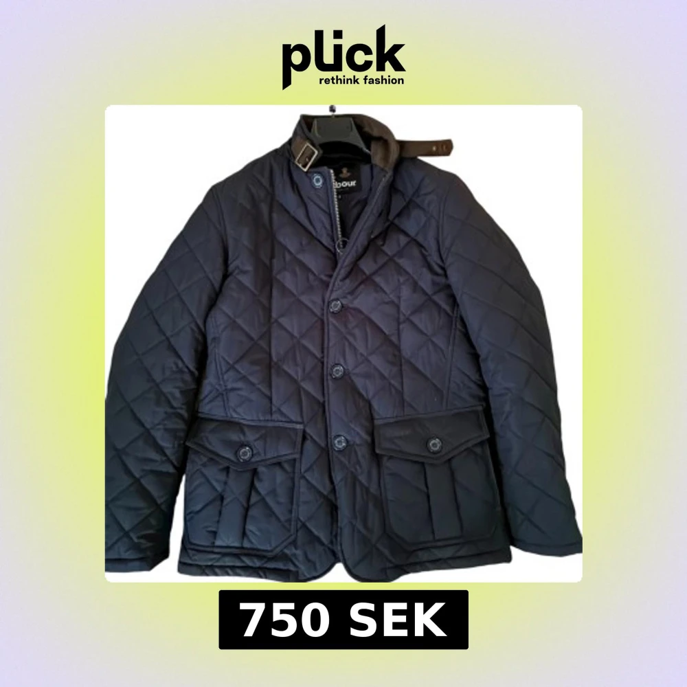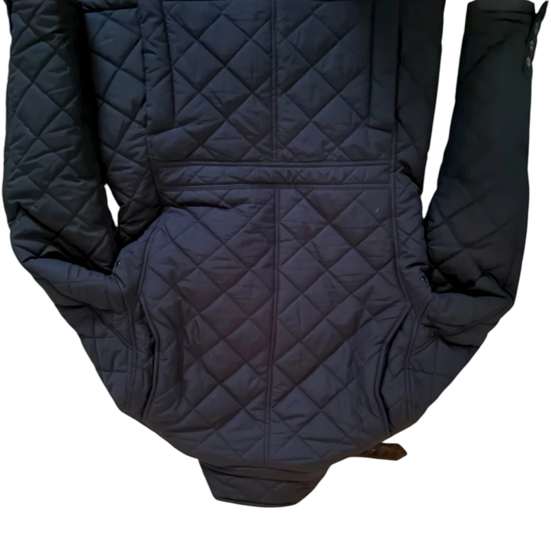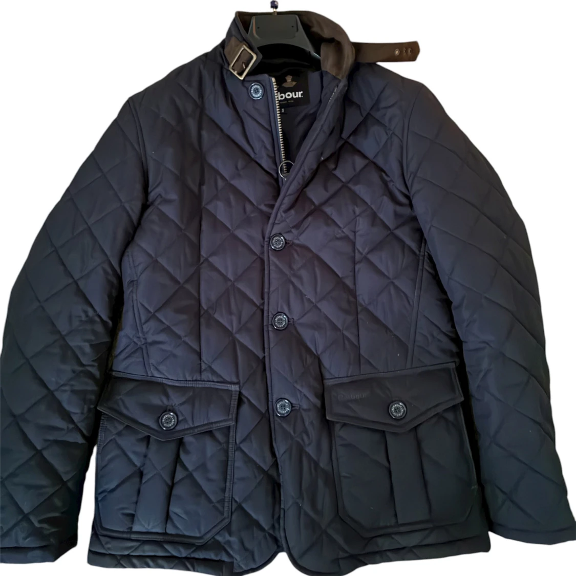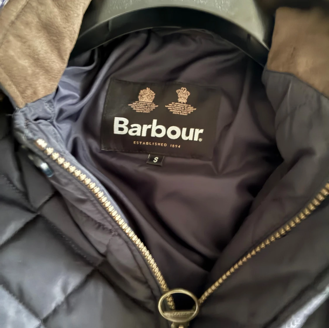 Quiltad mörkblå jacka från Barbour med snygg krage och spänne, stora fickor med knappar och både dragkedja och knappstängning. Jackan har långärmade ärmar och klassisk Barbour-logga på insidan. Perfekt för dig som gillar stilren och tidlös design.