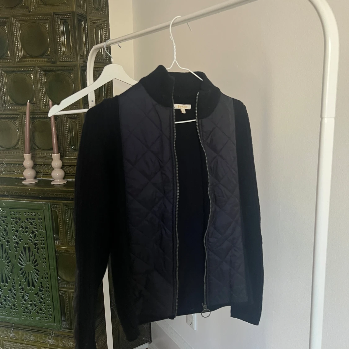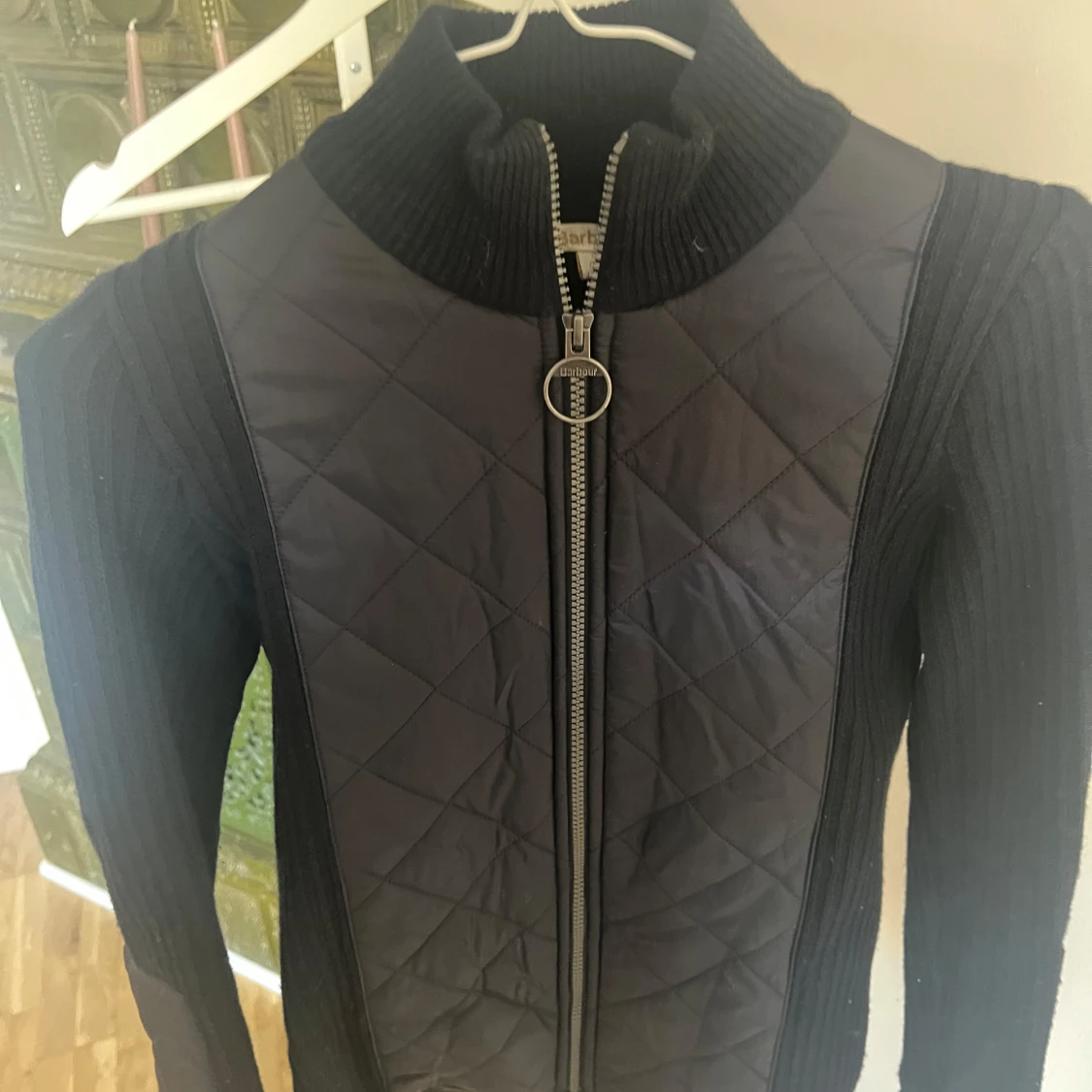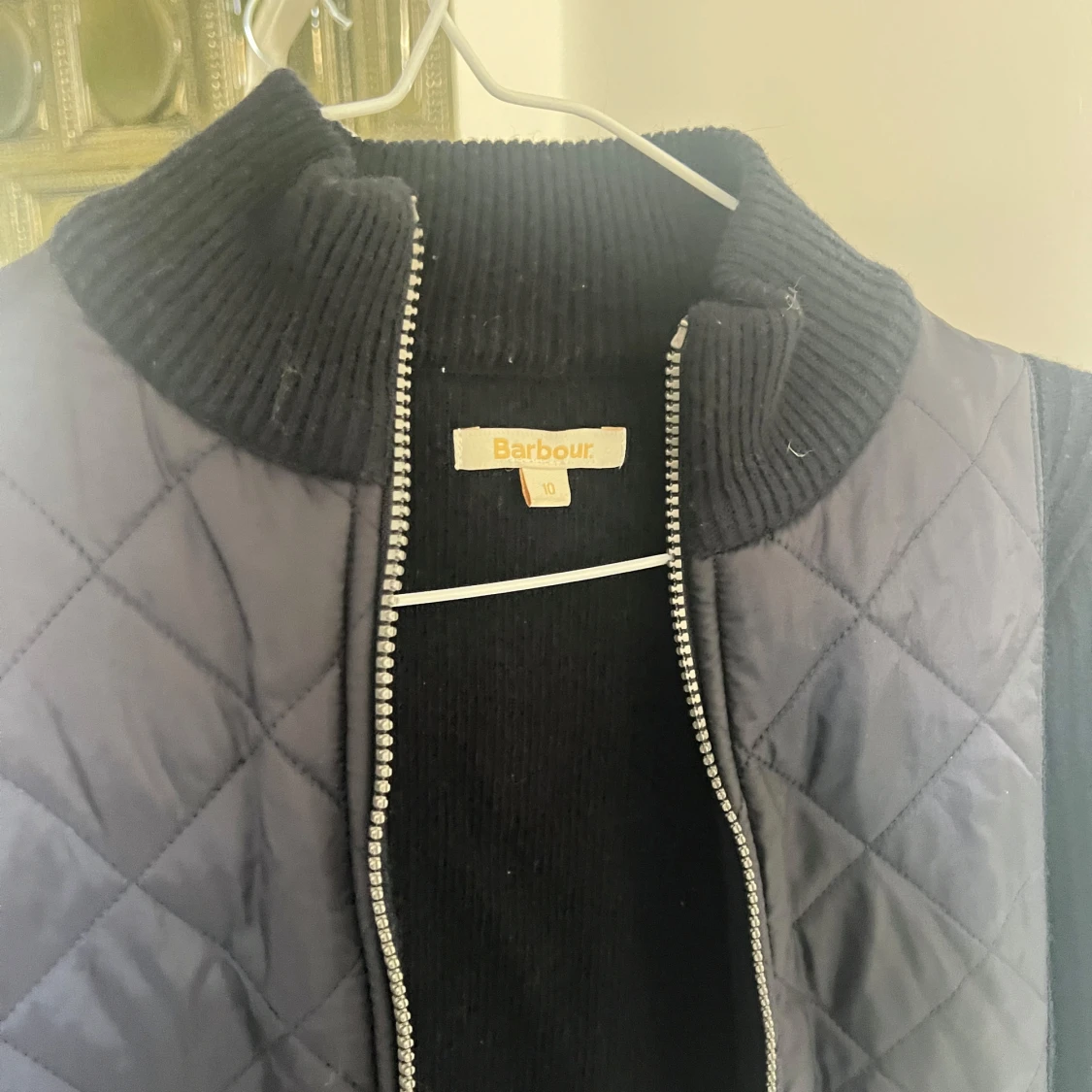 Säljer en jacka från Barbour med quiltade partier framtill och på ärmarna. Jackan har ribbad krage och ärmar samt dragkedja med rund detalj.
