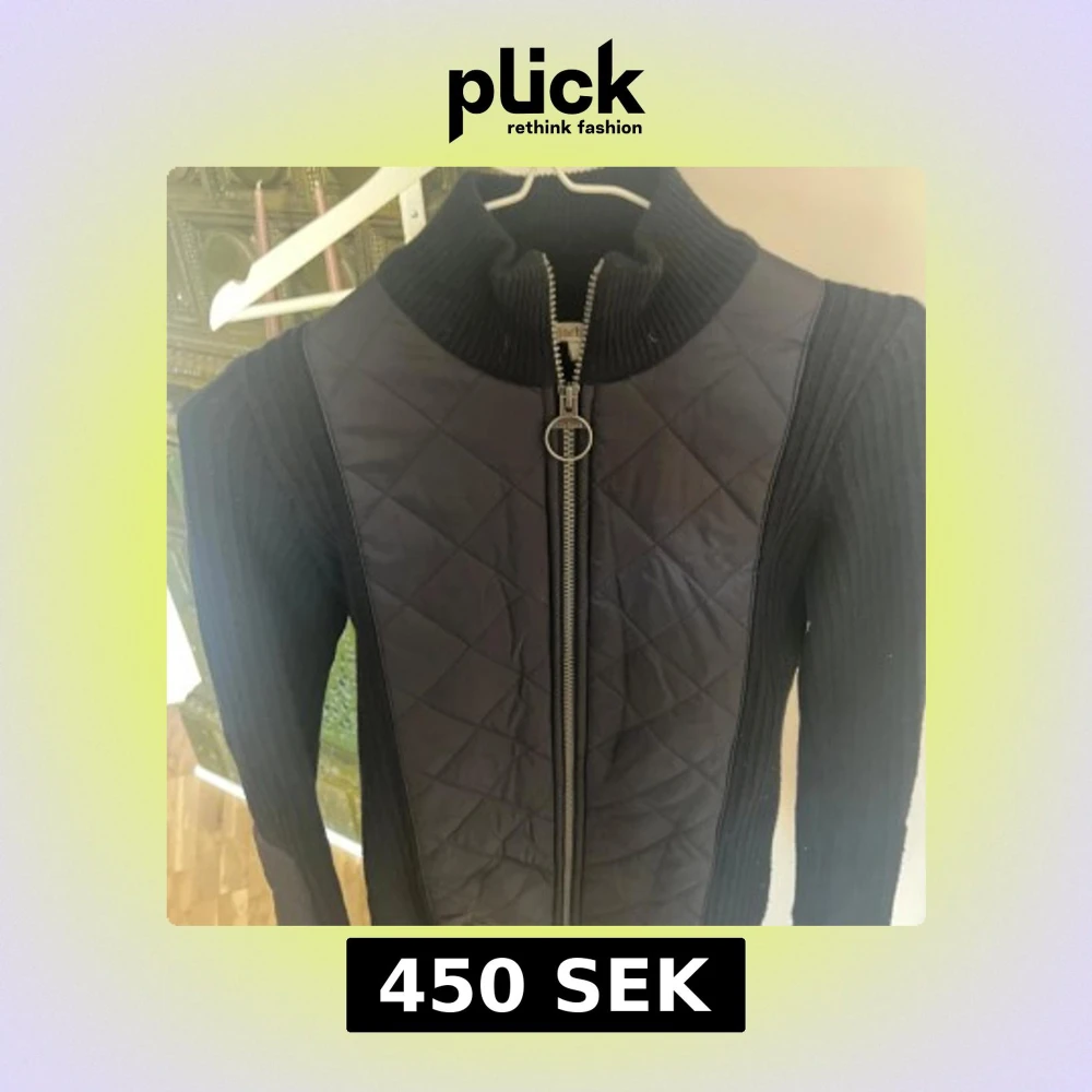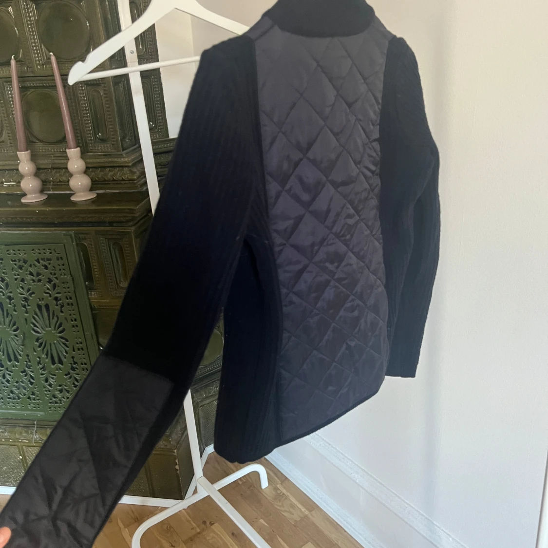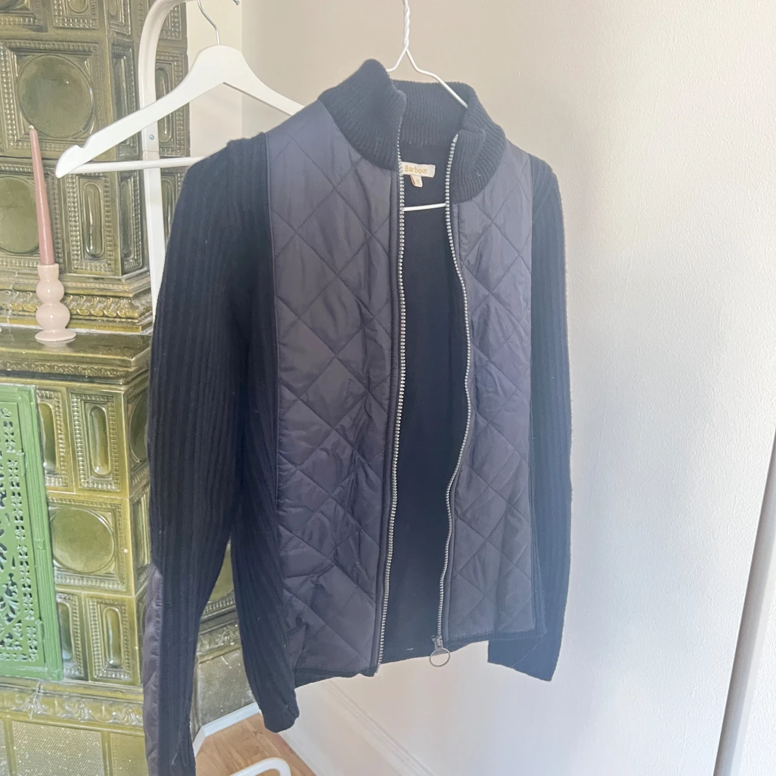 Säljer en jacka från Barbour med quiltade partier framtill och på ärmarna. Jackan har ribbad krage och ärmar samt dragkedja med rund detalj.