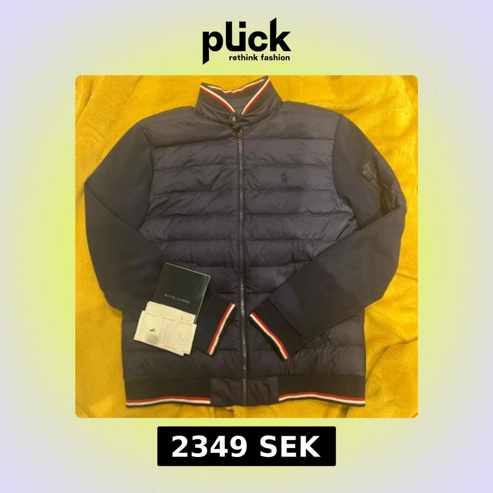 Snygg mörkblå pufferjacka från Ralph Lauren med dragkedja och ribbade detaljer i rött och vitt. Jackan har långa ärmar och en broderad logga på bröstet. Perfekt för kyliga dagar! Size s fits M