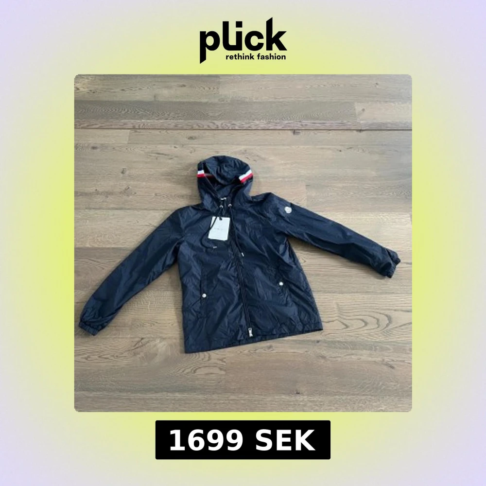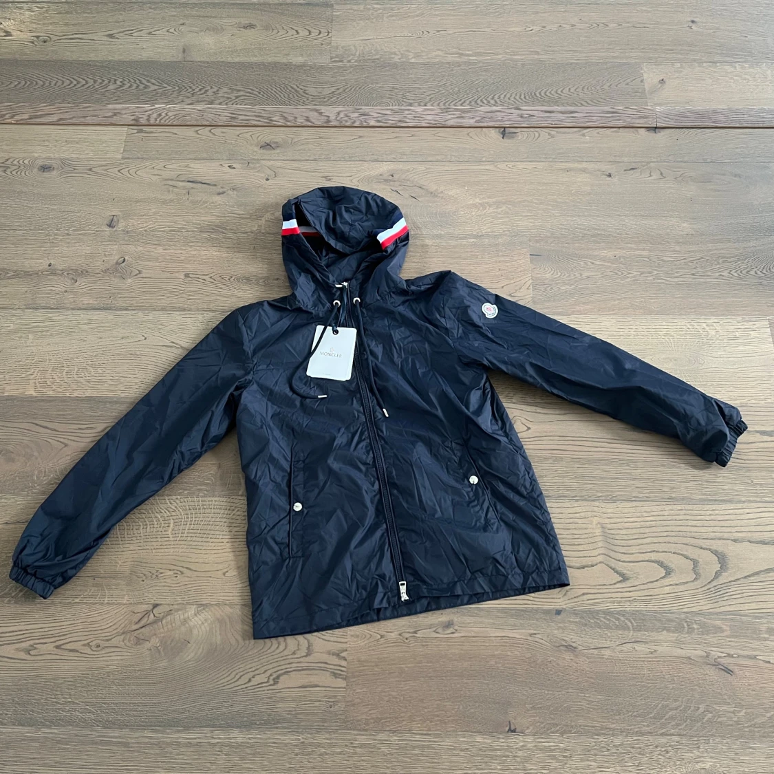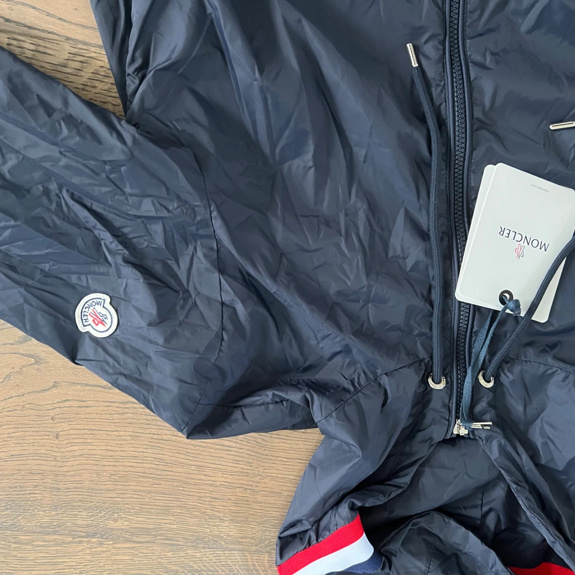 Mörkblå regnjacka från Moncler med huva och snygga rödvita detaljer på kanten. Jackan har dragkedja framtill, snörning vid huvan och två fickor med tryckknappar. Perfekt nu till hösten, pris kan diskuteras vid snabbaffär
