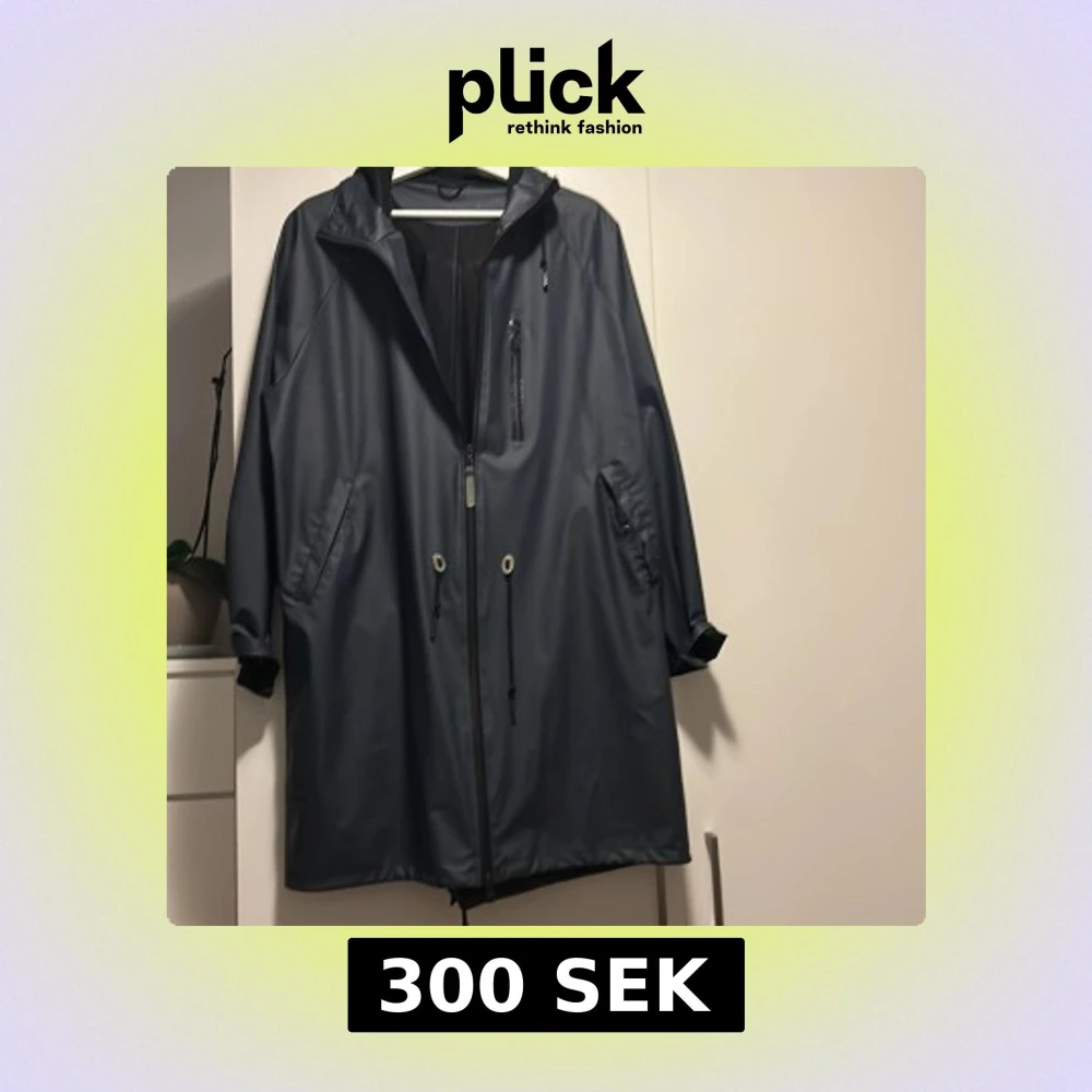 Snygg mörkblå regnjacka från Stenk i storlek L-XL. Jackan har huva, dragkedja framtill, snörning i midjan och flera fickor. Materialet är syntet och jackan har en loose passform med långa ärmar. Perfekt för regniga dagar. knappt använd