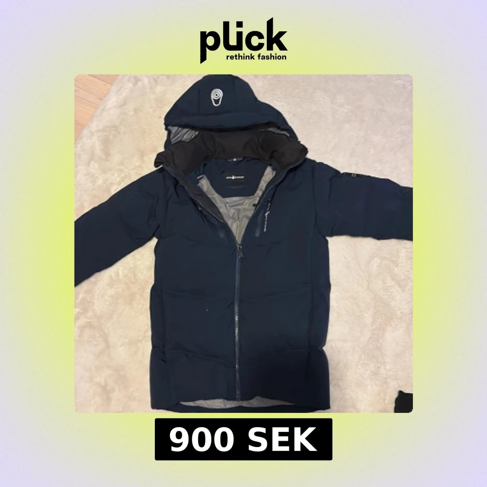 Säljer en mörkblå dunjacka från Sail Racing med huva och snygga detaljer. Jackan har hel dragkedja, lång ärm och grått foder. Perfekt för kalla dagar och har en clean look med logga på ärmen och huvan. Pytte pytte pytte litet hål som inte syns det är på framsidan det syns knappt som ni ser på bilderna😃