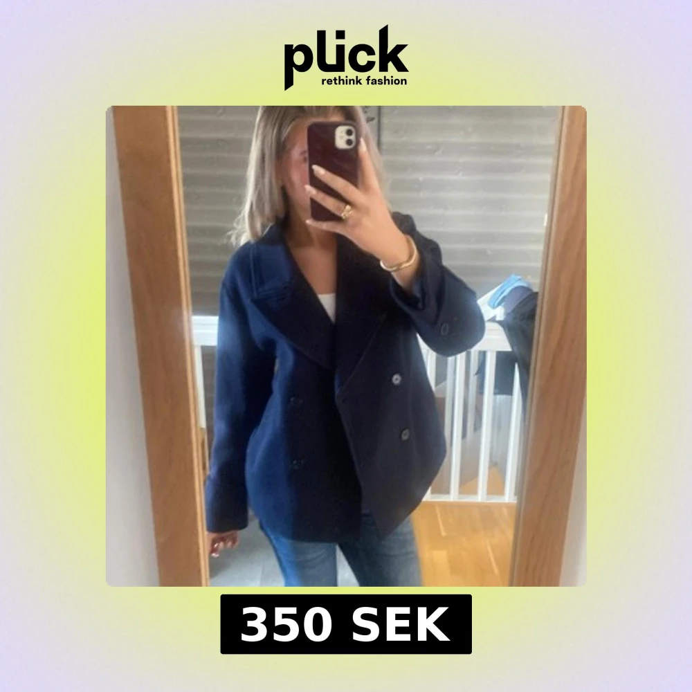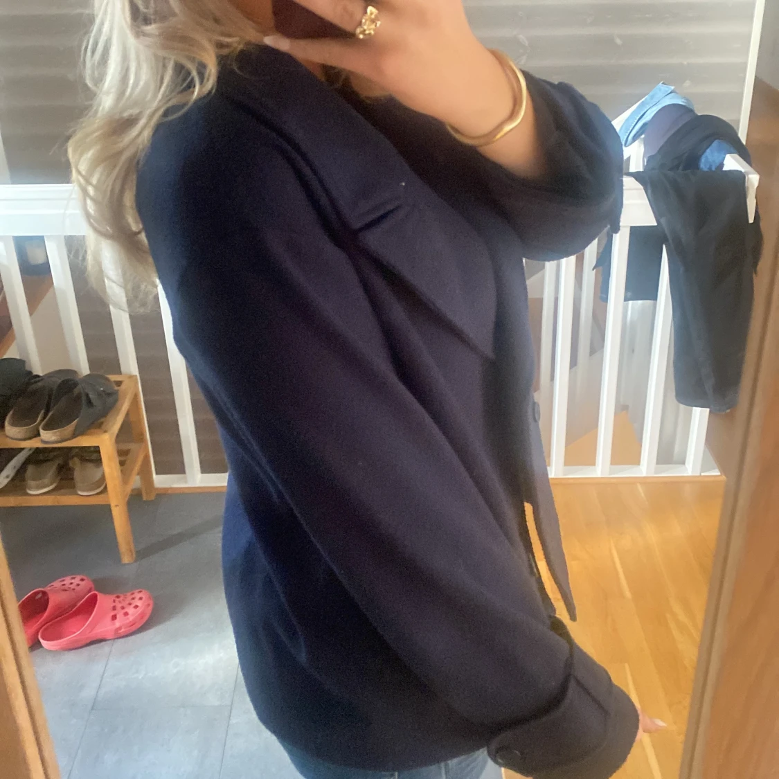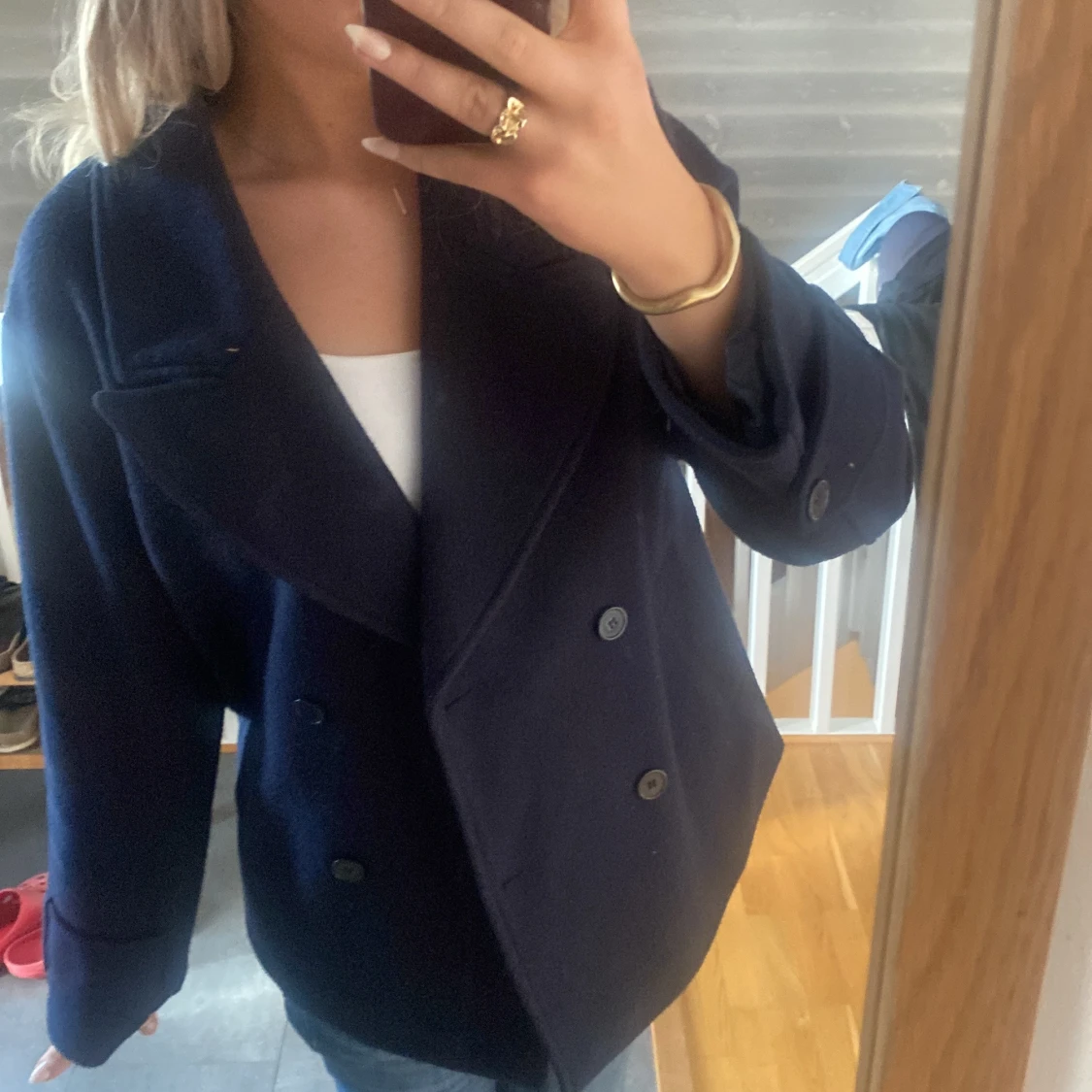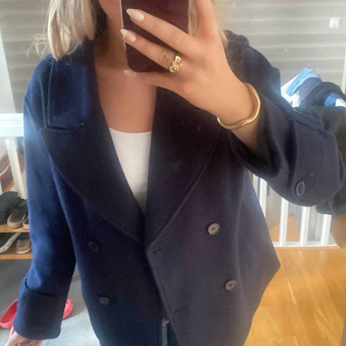 Säljer en klassisk mörkblå skepparkavaj med dubbelknäppning och bred krage. Jackan har en rak passform och är tillverkad i ull, perfekt för kyligare dagar. Snygg och tidlös modell som passar till jeans eller dressat.